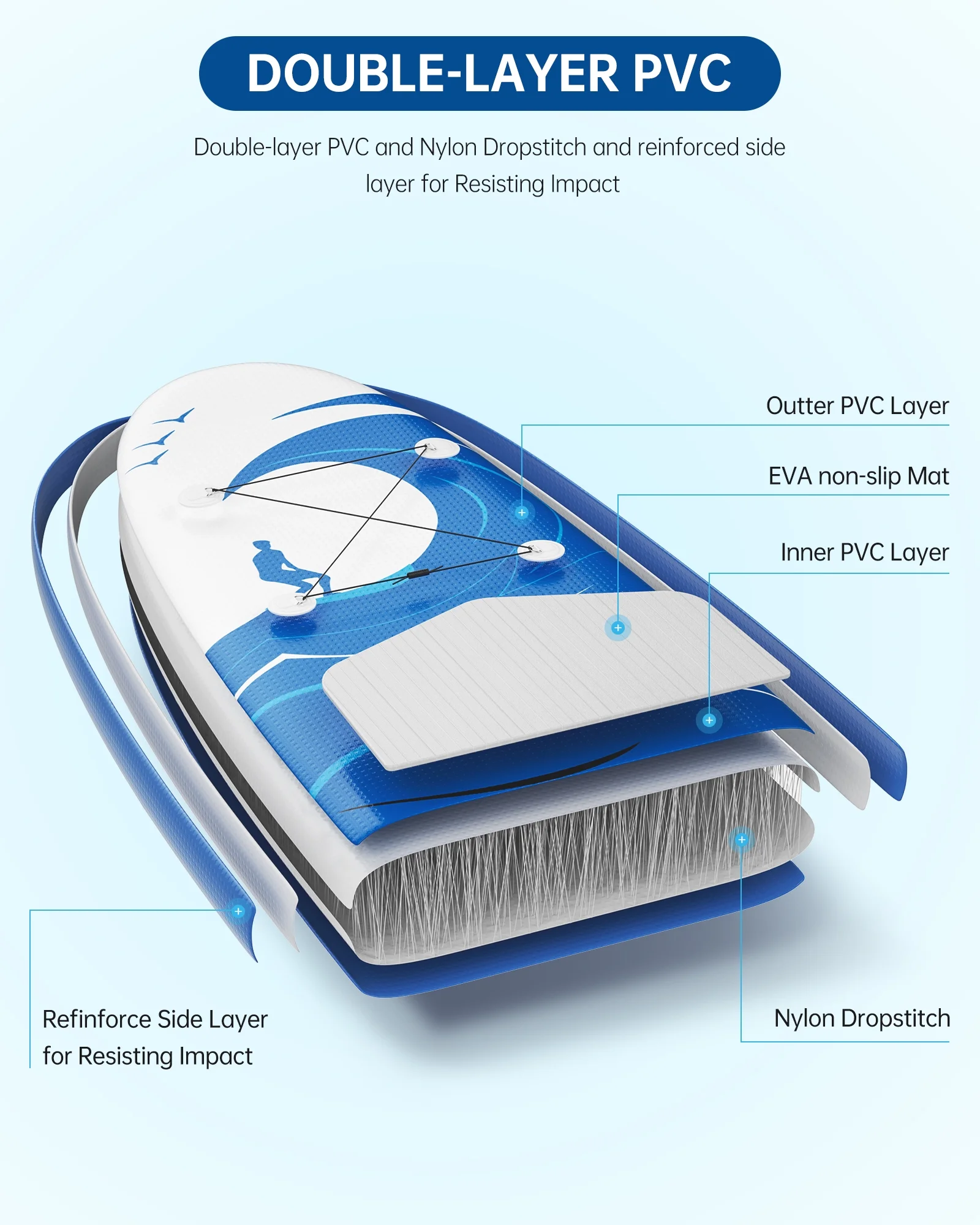 - 🌊Non-slip Deck: The middle deck of the inflatable paddle board is made of high-quality EVA material, and is treated with diagonal grooves to increase friction, strong non-slip, and make standing more stable