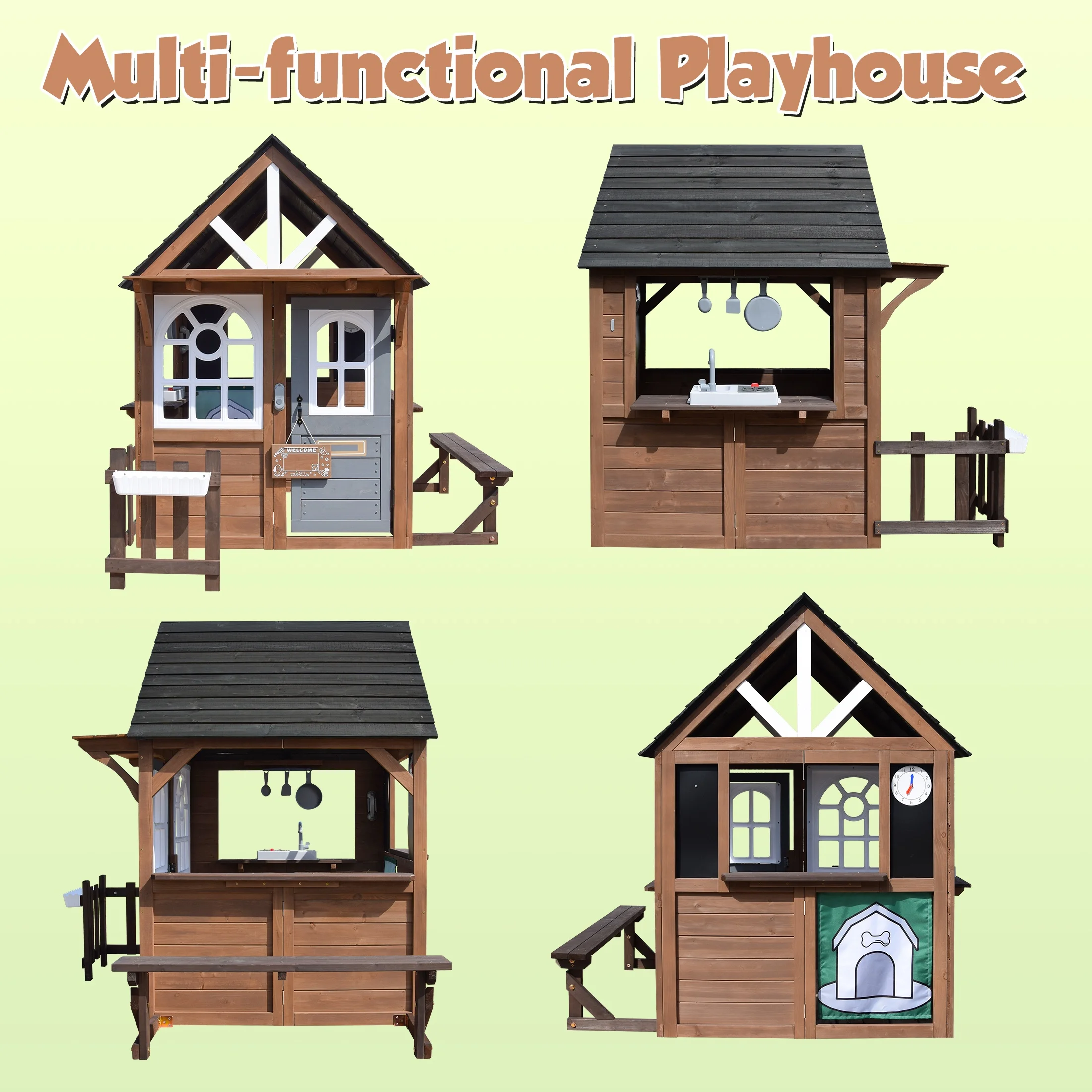 Imagine a world of endless possibilities right in your backyard with our exquisite wooden playhouse. Designed with a sophisticated blend of deep brown and gray, this kids playhouse is crafted from high-quality wood, ensuring durability and timeless appeal. Children will love the quaint charm of their own private retreat, complete with a welcoming fence and a cozy bench for outdoor relaxation. Inside, the outdoor playhouse features a delightful kitchen setup, including a pretend faucet and sink, a simulated stovetop, and a set of three plastic cooking utensils, perfect for aspiring young chefs. The realistic details continue with window sills for imaginative play, a special dog door for pet-friendly fun, and a customizable door nameplate for a personal touch. Kids can let their creativity soar on the chalkboard or learn to manage time with the two engaging plastic clock faces. The playhouse is equipped with a pretend doorbell and a pretend phone, adding layers of interaction and role-playing excitement. This outdoor kids play equipment is not just a play area but a space where children can explore, learn, and create lifelong memories with outdoor toys.