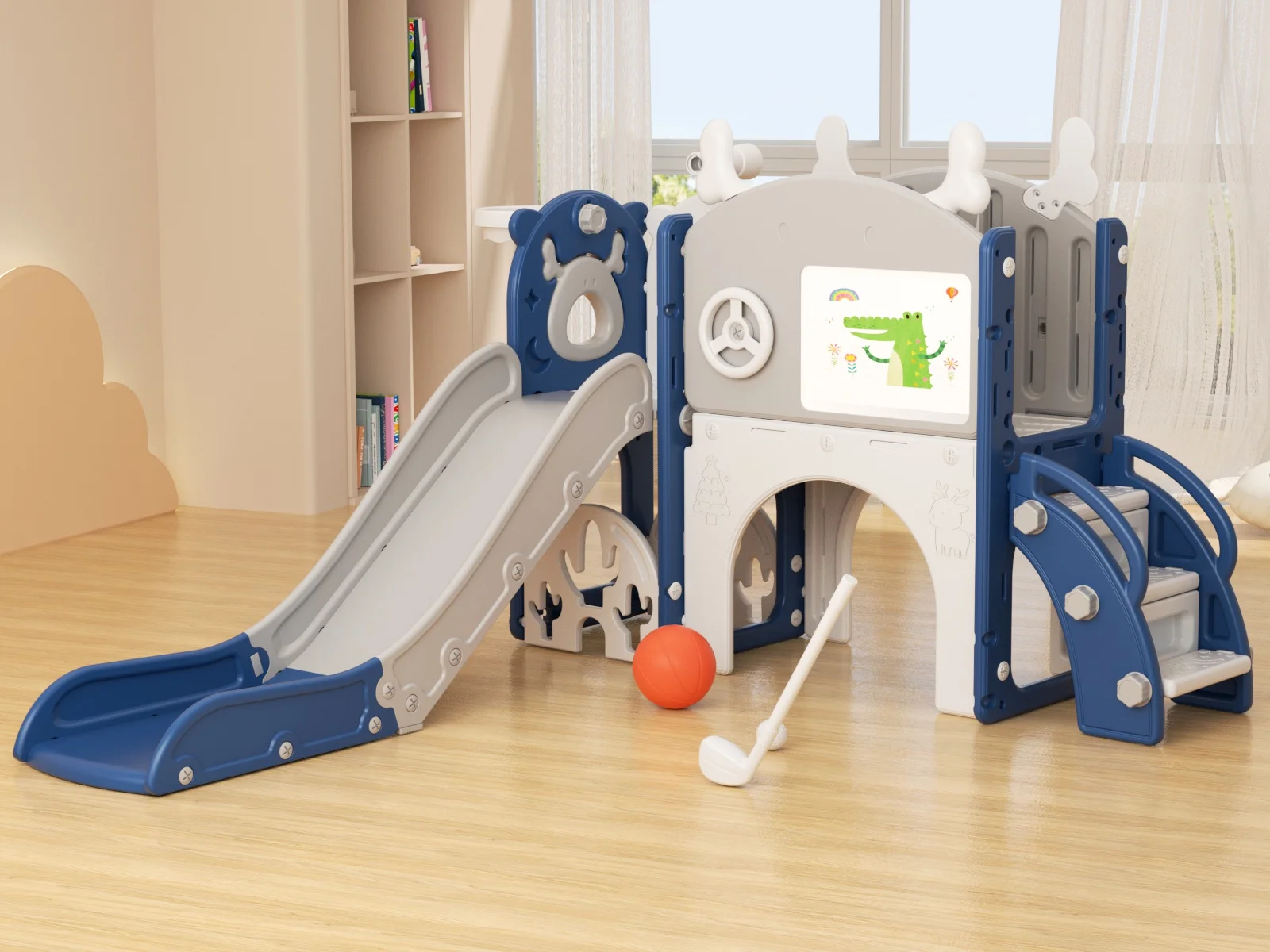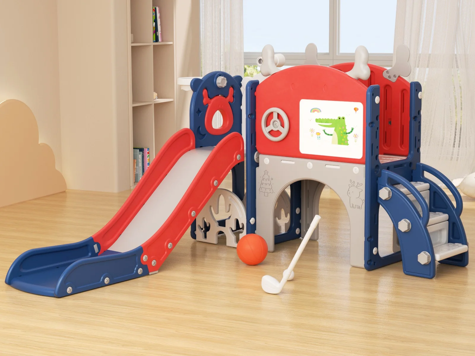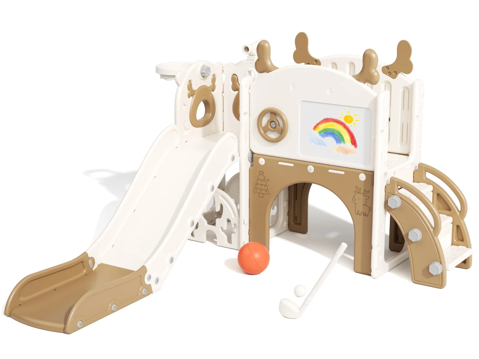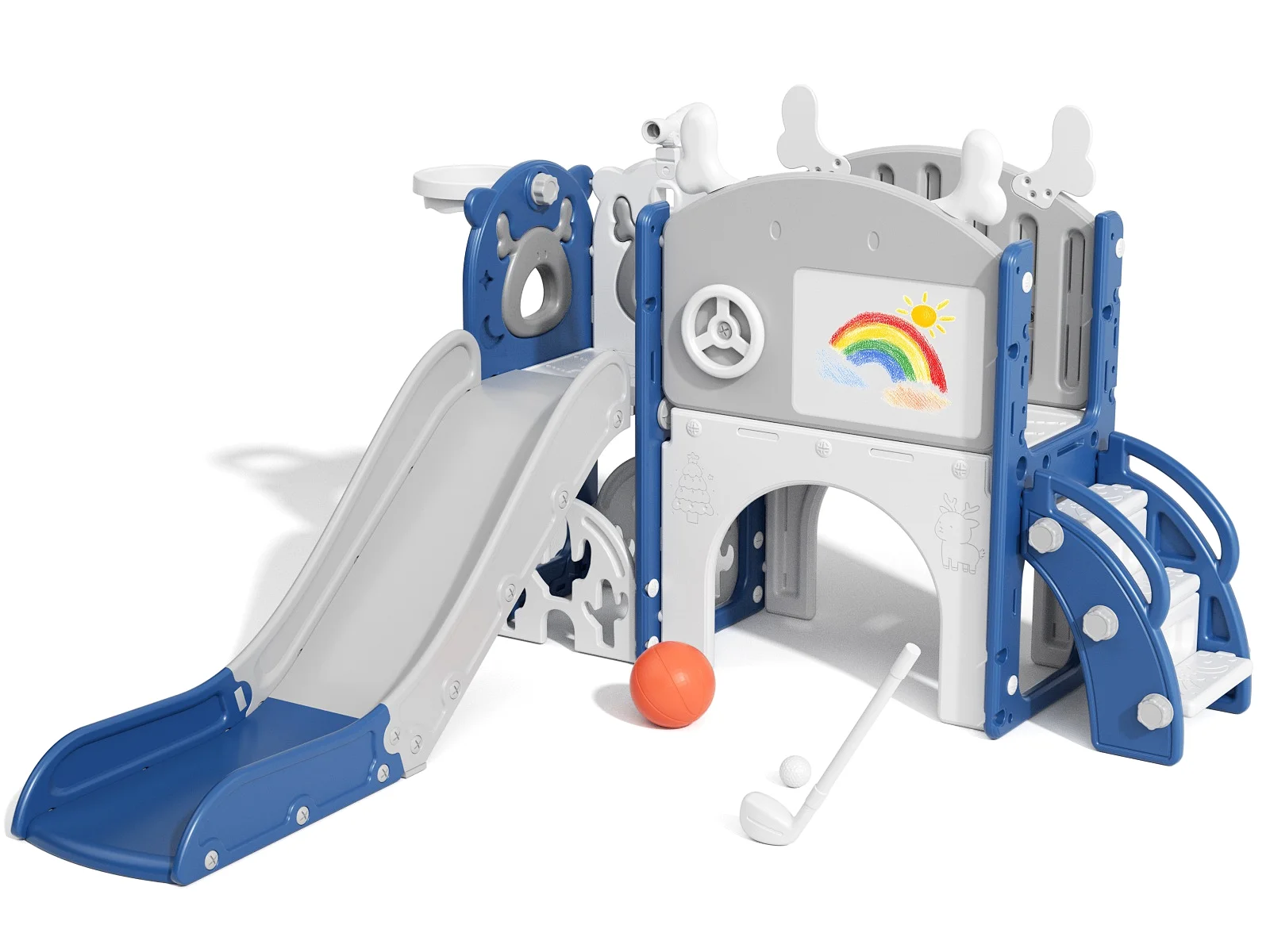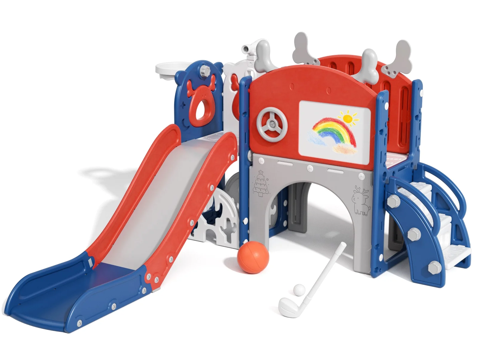- 12-in-1 includes Upgraded Golf Set: KORIMEFA playground features the latest golf set for enhanced fun and skill-building, along with a slide, basketball, telescope, stairs, steering wheel, crawling aisle, hide-and-seek hole, tunnel, and storage space