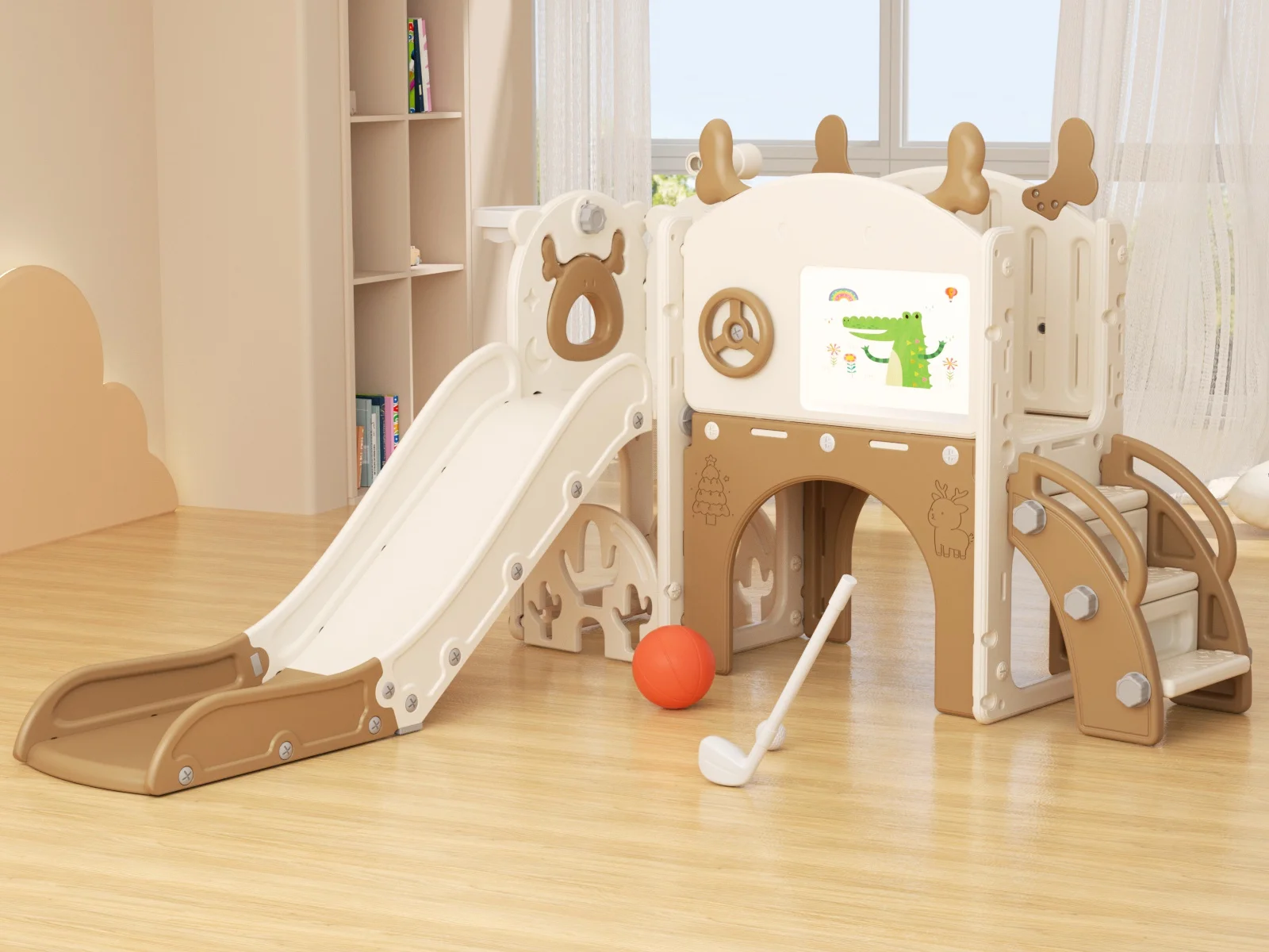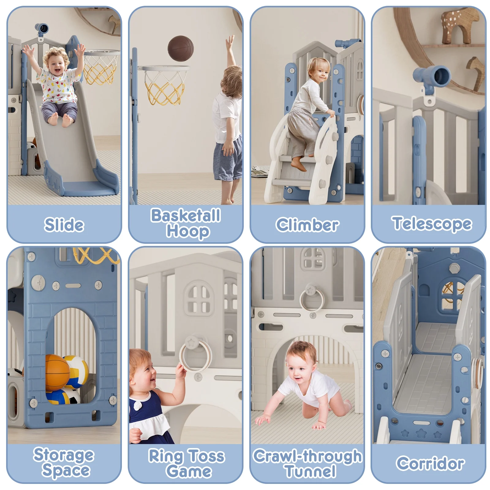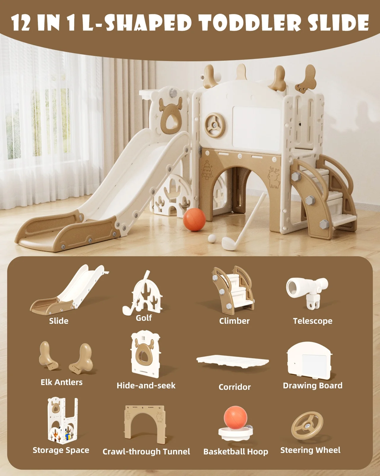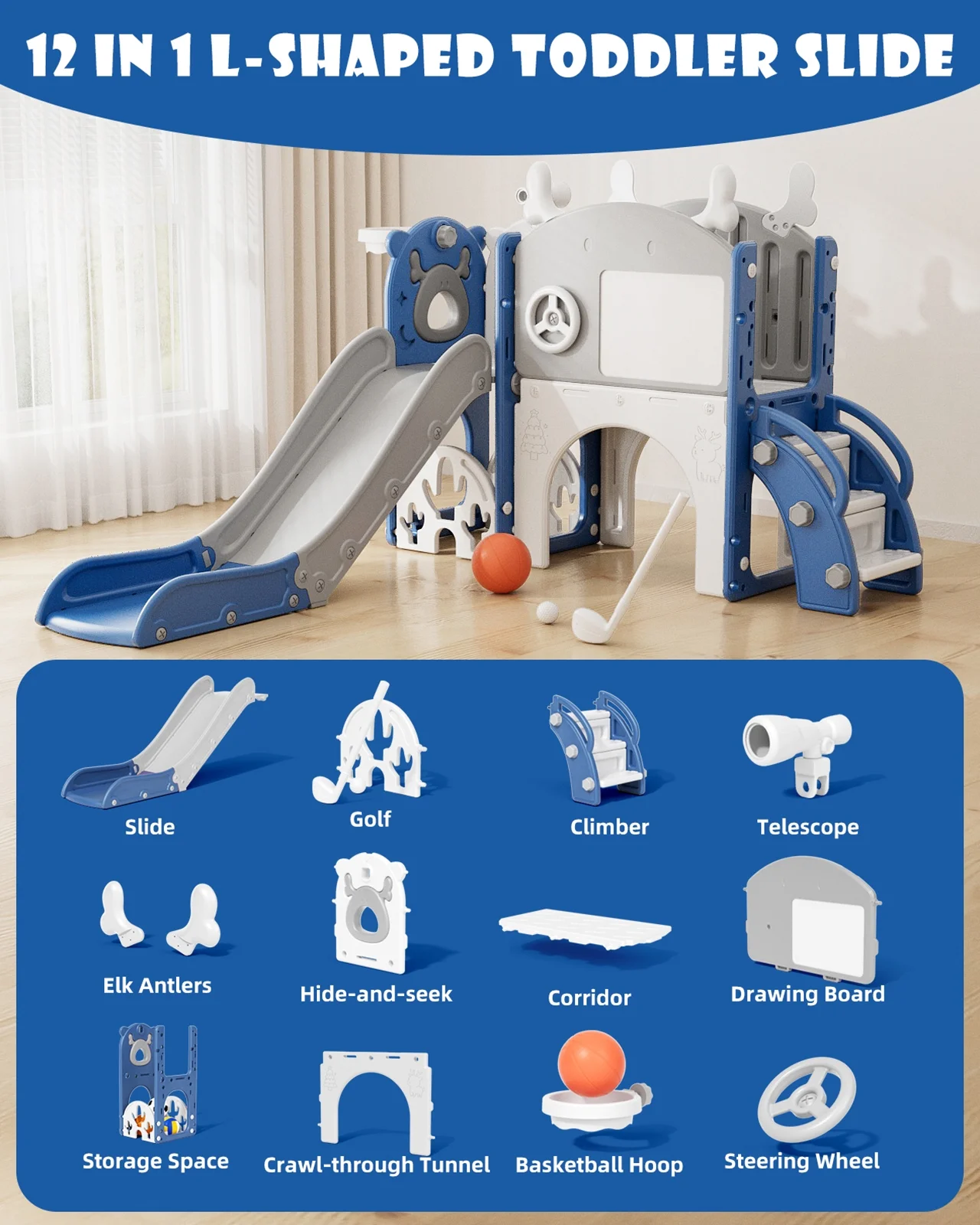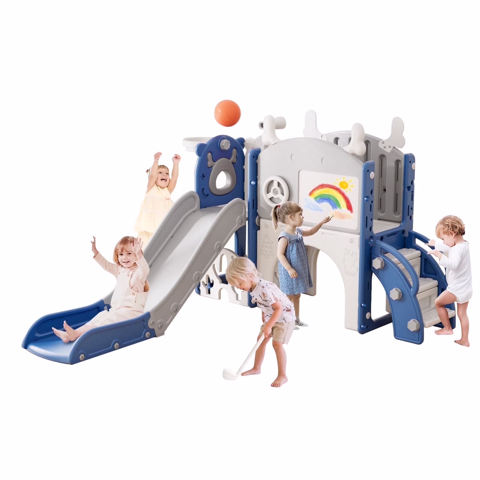 - 12-in-1 includes Upgraded Golf Set: KORIMEFA playground features the latest golf set for enhanced fun and skill-building, along with a slide, basketball, telescope, stairs, steering wheel, crawling aisle, hide-and-seek hole, tunnel, and storage space