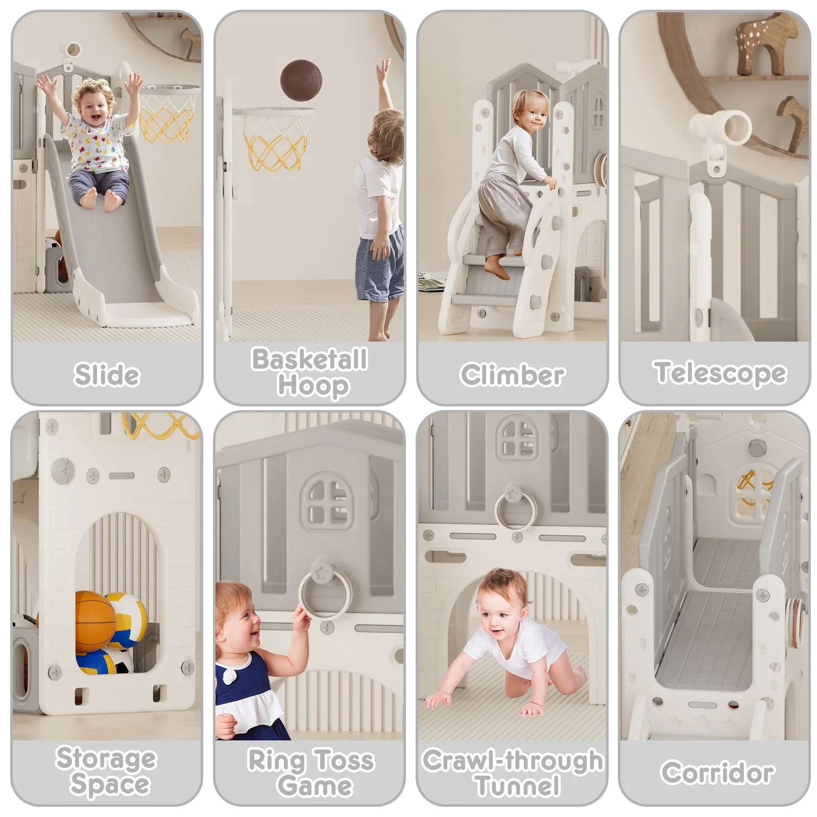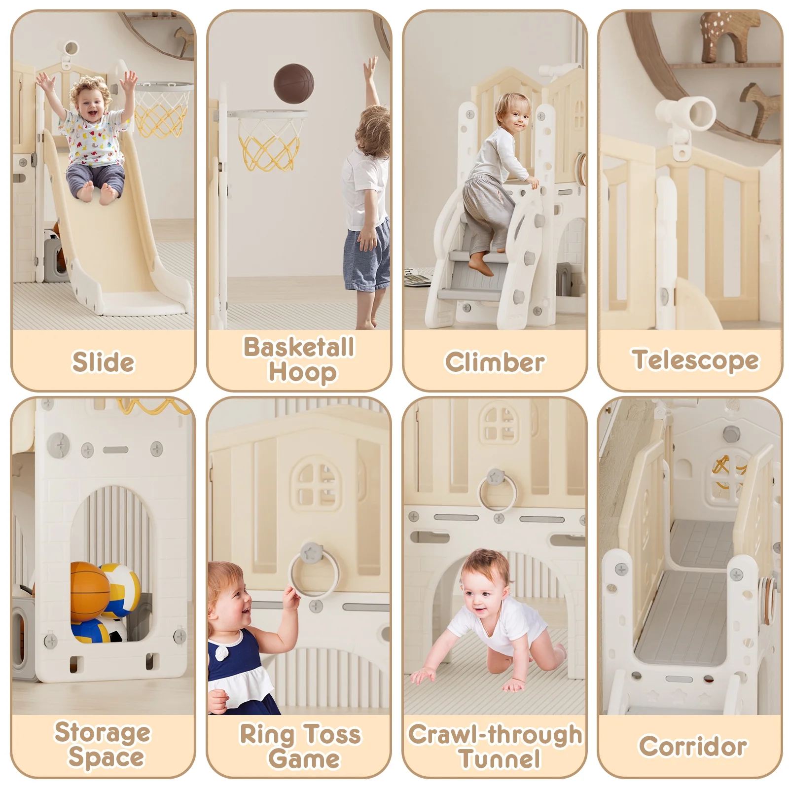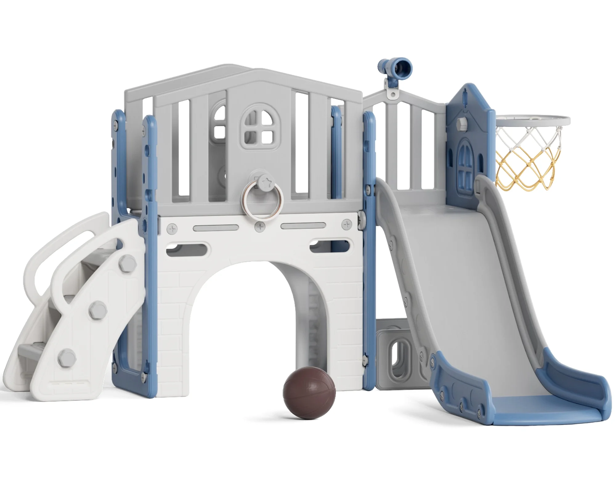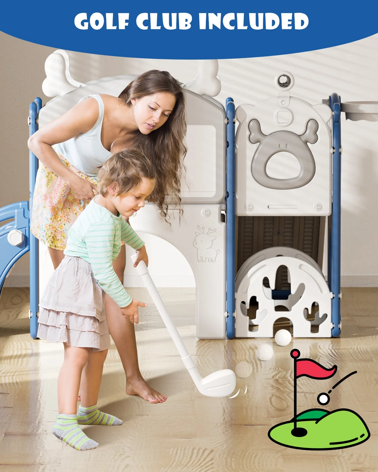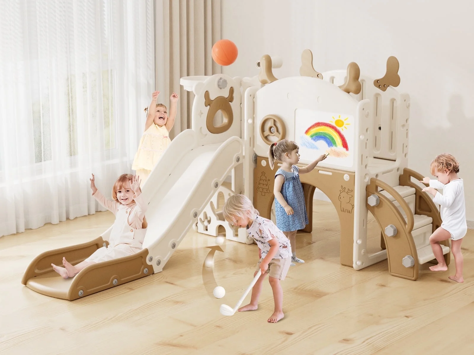 - 12-in-1 includes Upgraded Golf Set: KORIMEFA playground features the latest golf set for enhanced fun and skill-building, along with a slide, basketball, telescope, stairs, steering wheel, crawling aisle, hide-and-seek hole, tunnel, and storage space