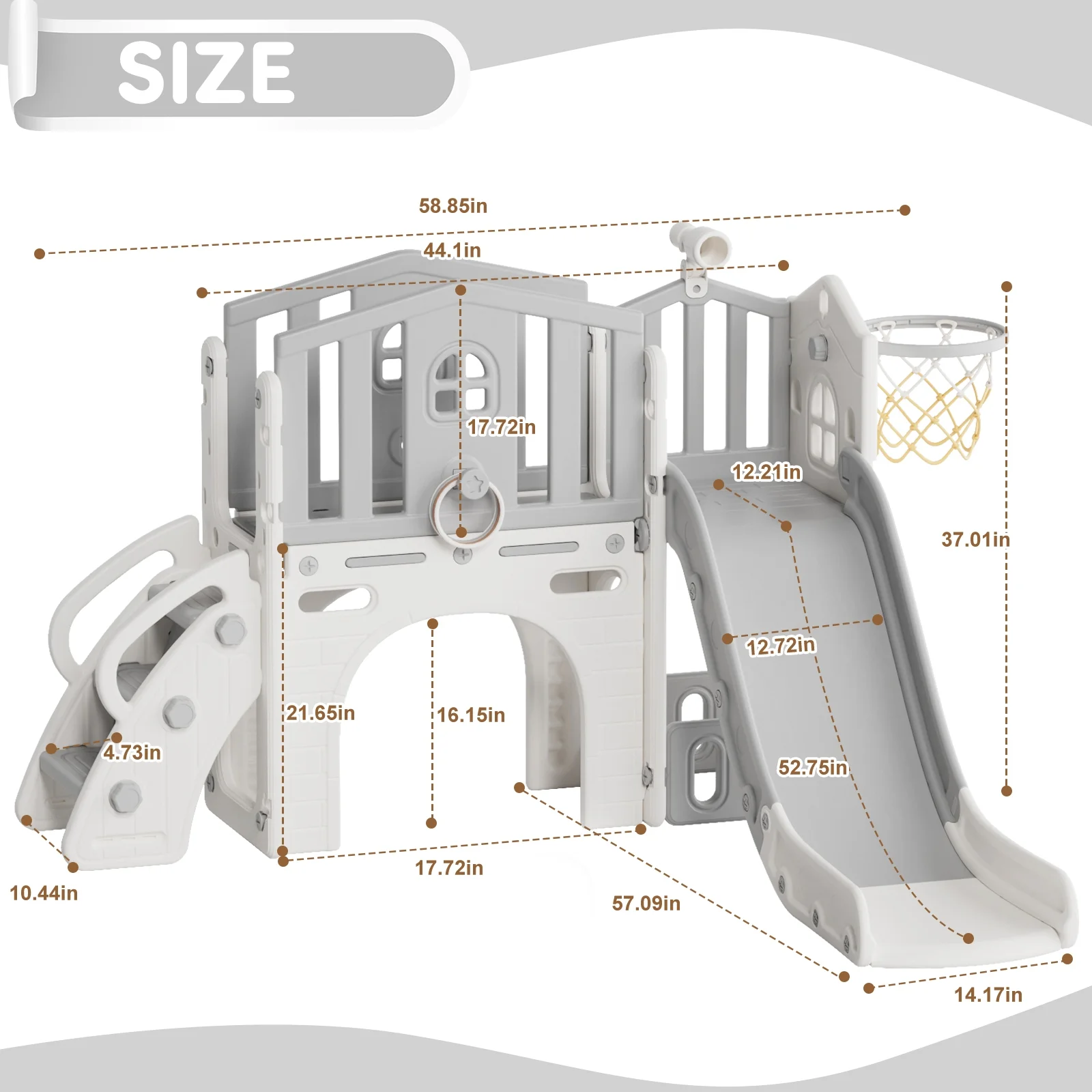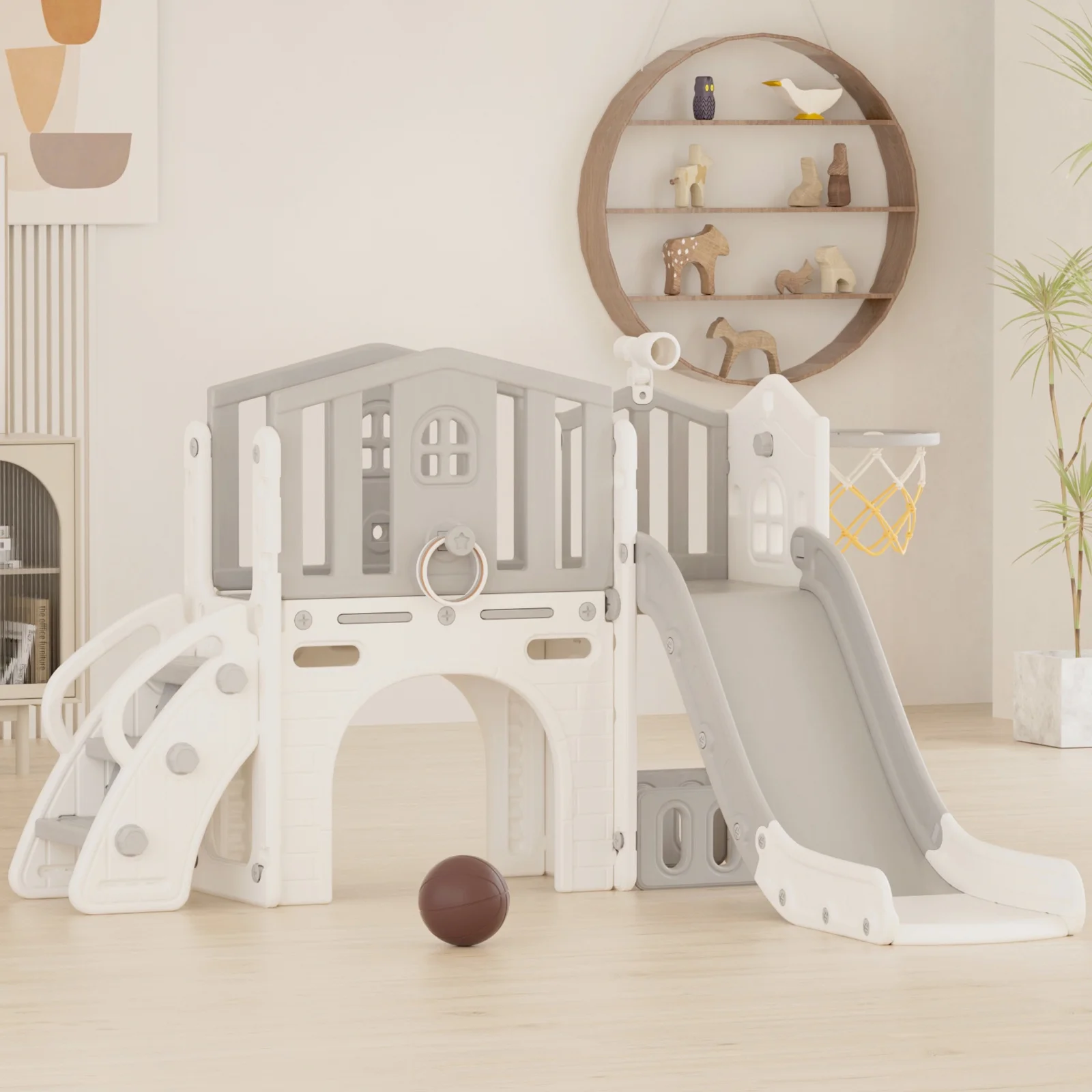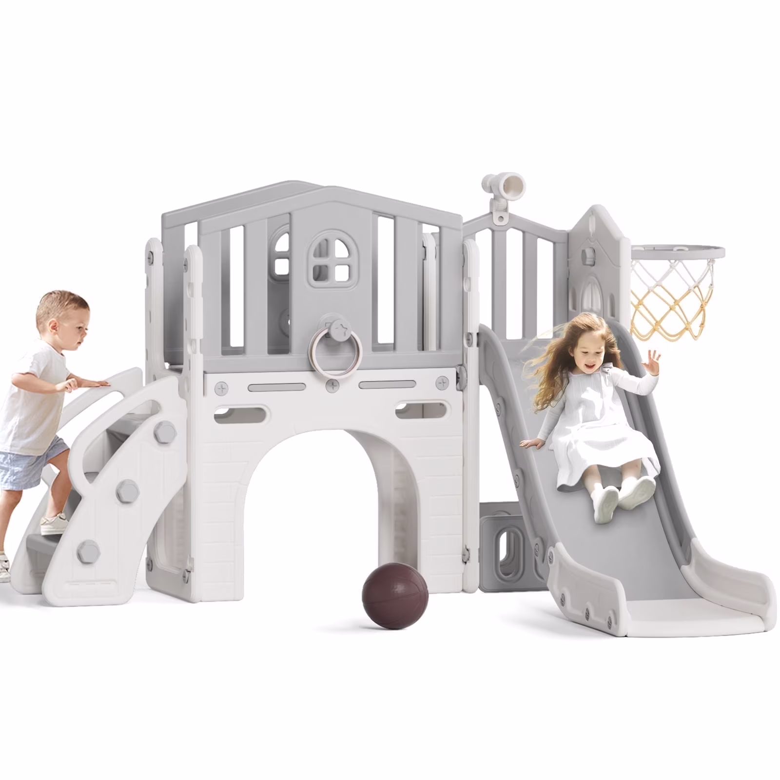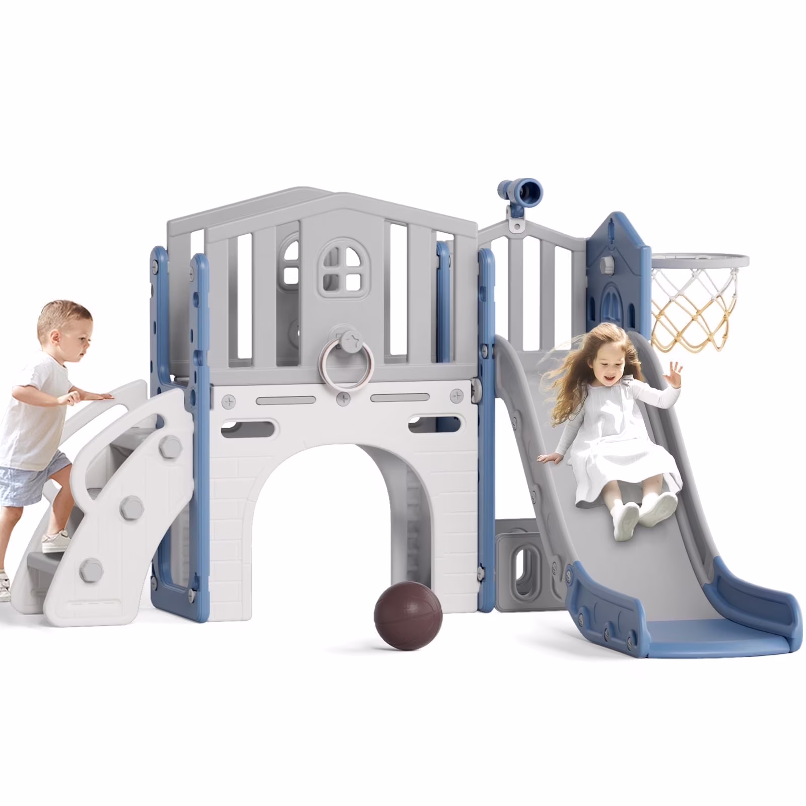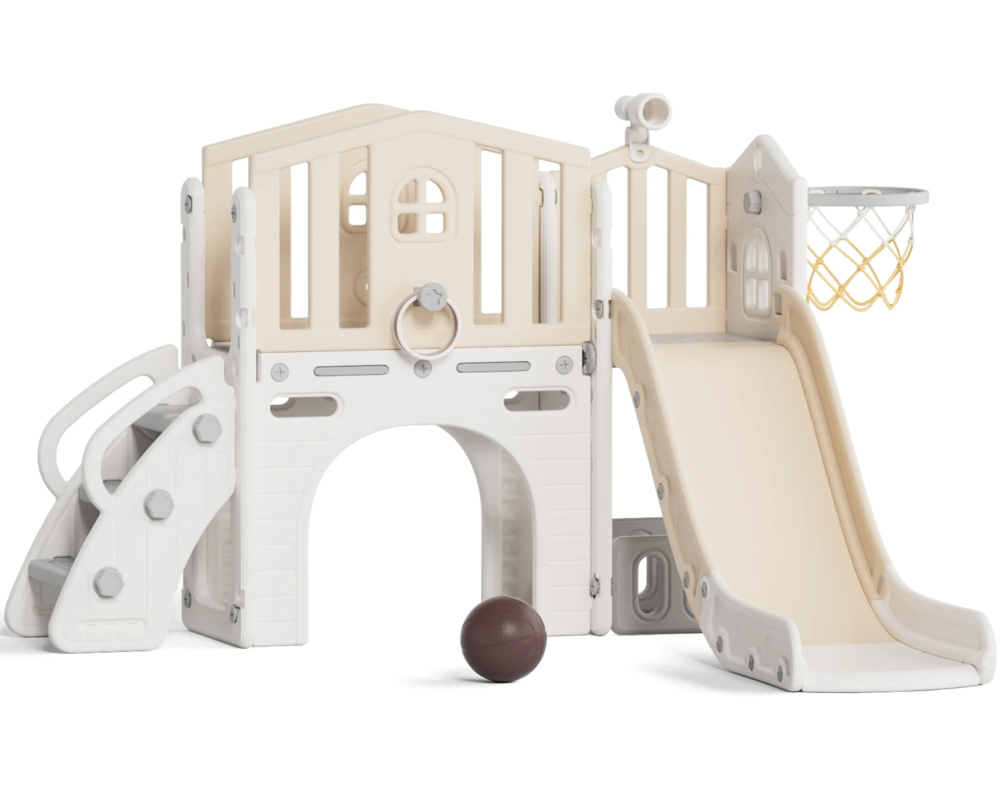 - 12-in-1 includes Upgraded Golf Set: KORIMEFA playground features the latest golf set for enhanced fun and skill-building, along with a slide, basketball, telescope, stairs, steering wheel, crawling aisle, hide-and-seek hole, tunnel, and storage space