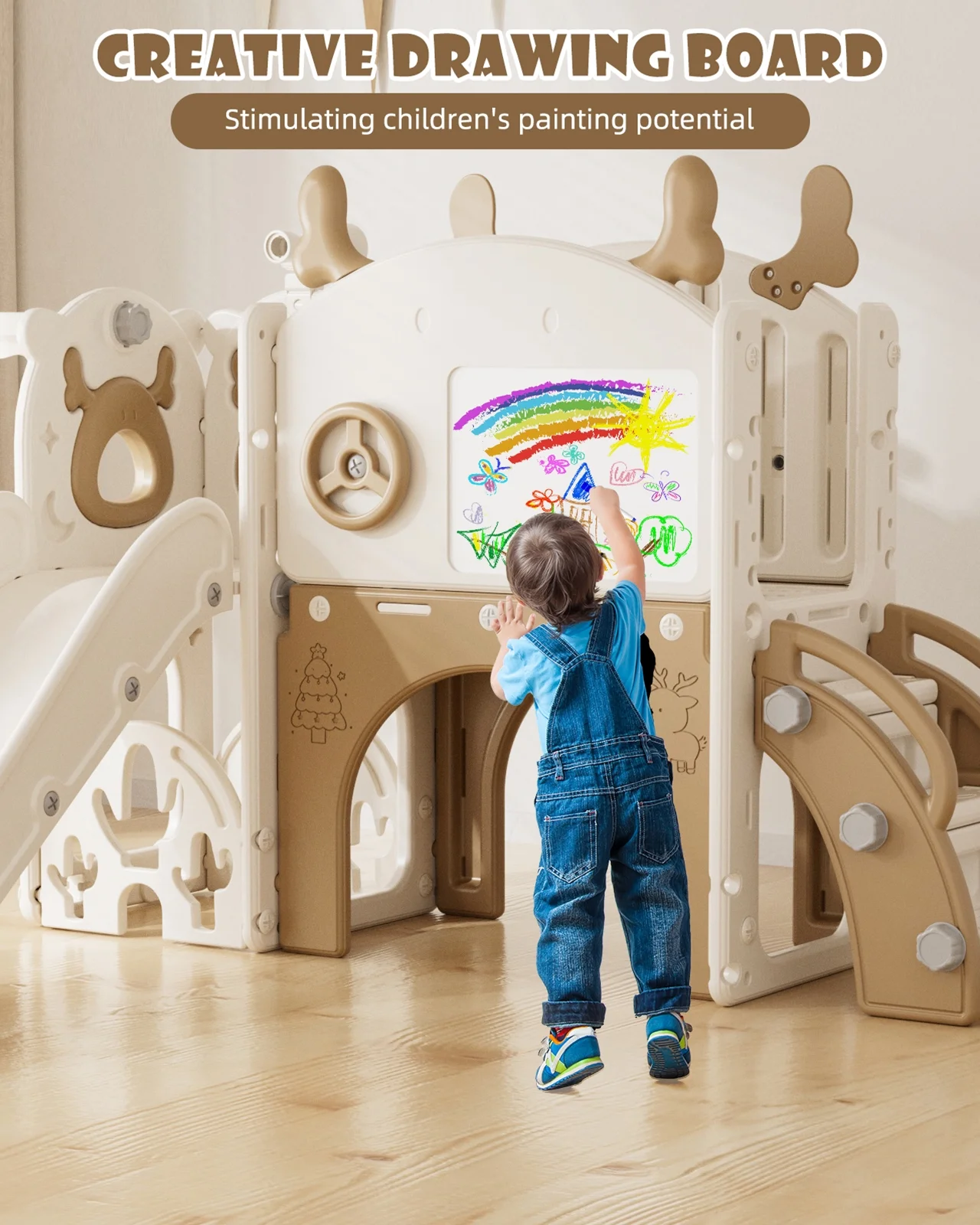 KORIMEFA toddler slide incorporates 12 activity areas, Newly launched the painting board and golf set which parts others without, including slide way, golf clubs and balls, drawing board and brush eraser, Steering heel, climbing, corridor, arch, toddler basketball hoop, telescope, and a storage spaces for toy storage. Our toddler slide outdoor play set helps kids to develop skills, promote fitness, balance and enhance the friendship while kids have fun.