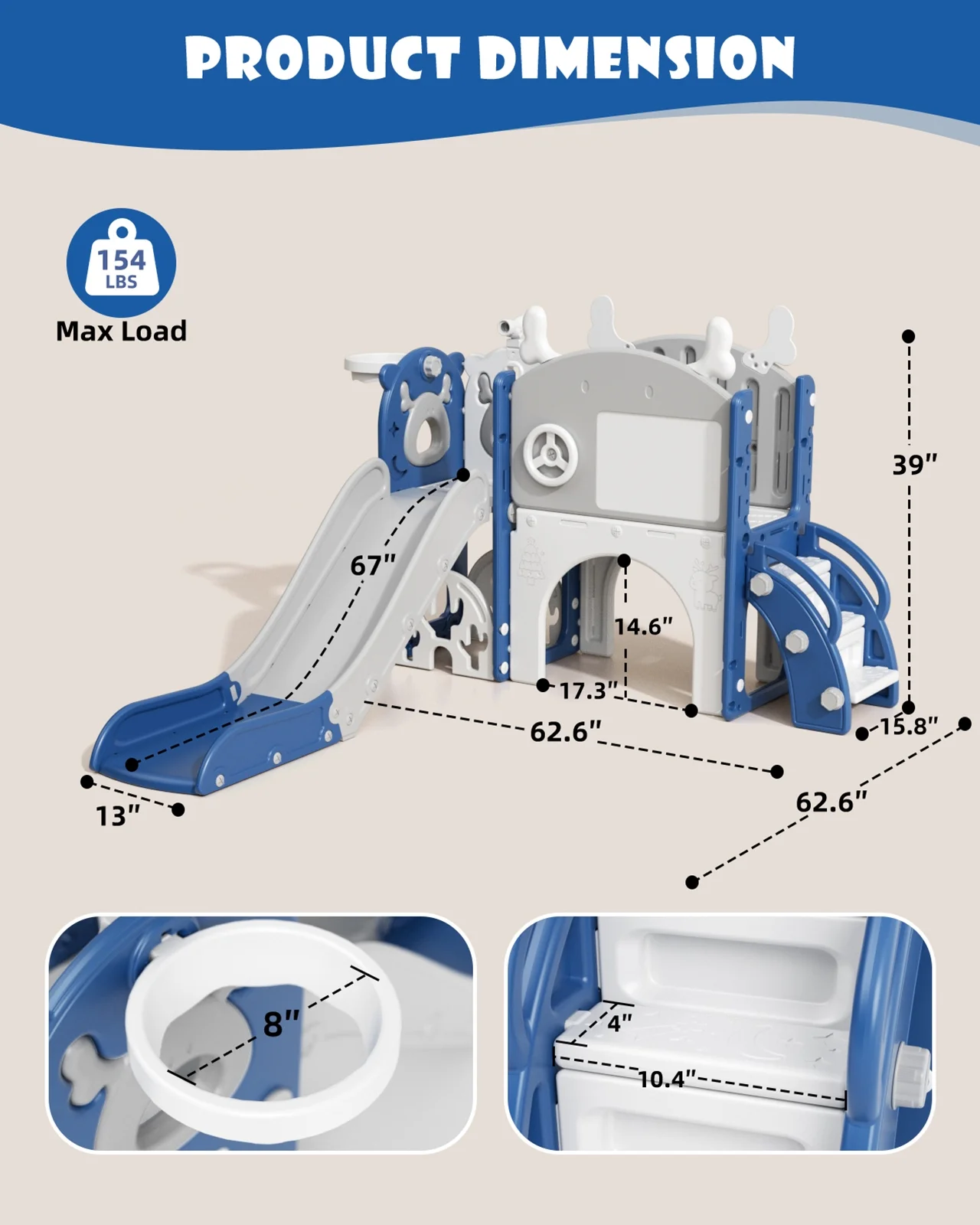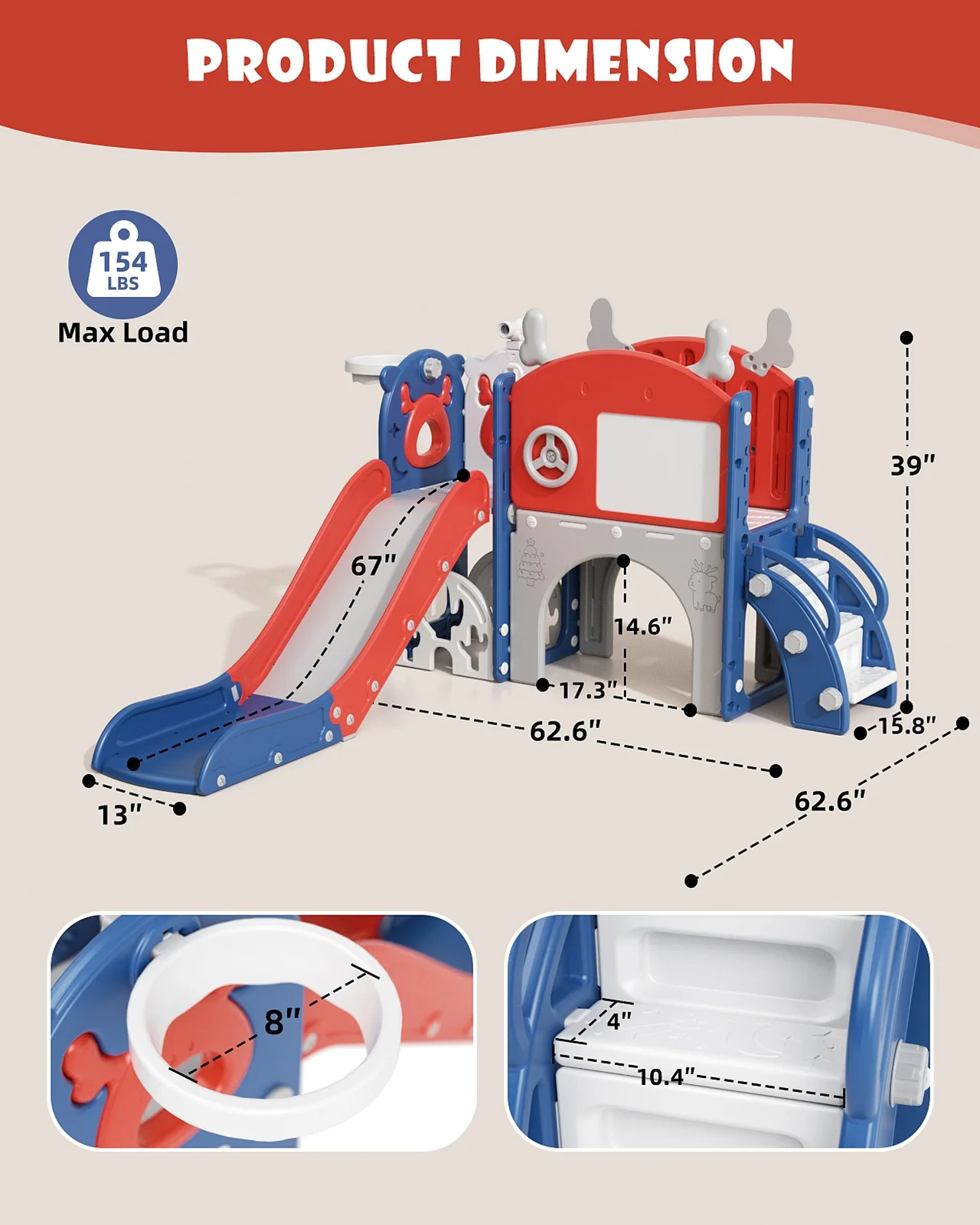 - Slide Climbing Play Set Size: 62.6 x 62.6 x 39 inches, Maximum Weight Capacity: 154 lbs, lightweight, easy to assemble, with higher stability