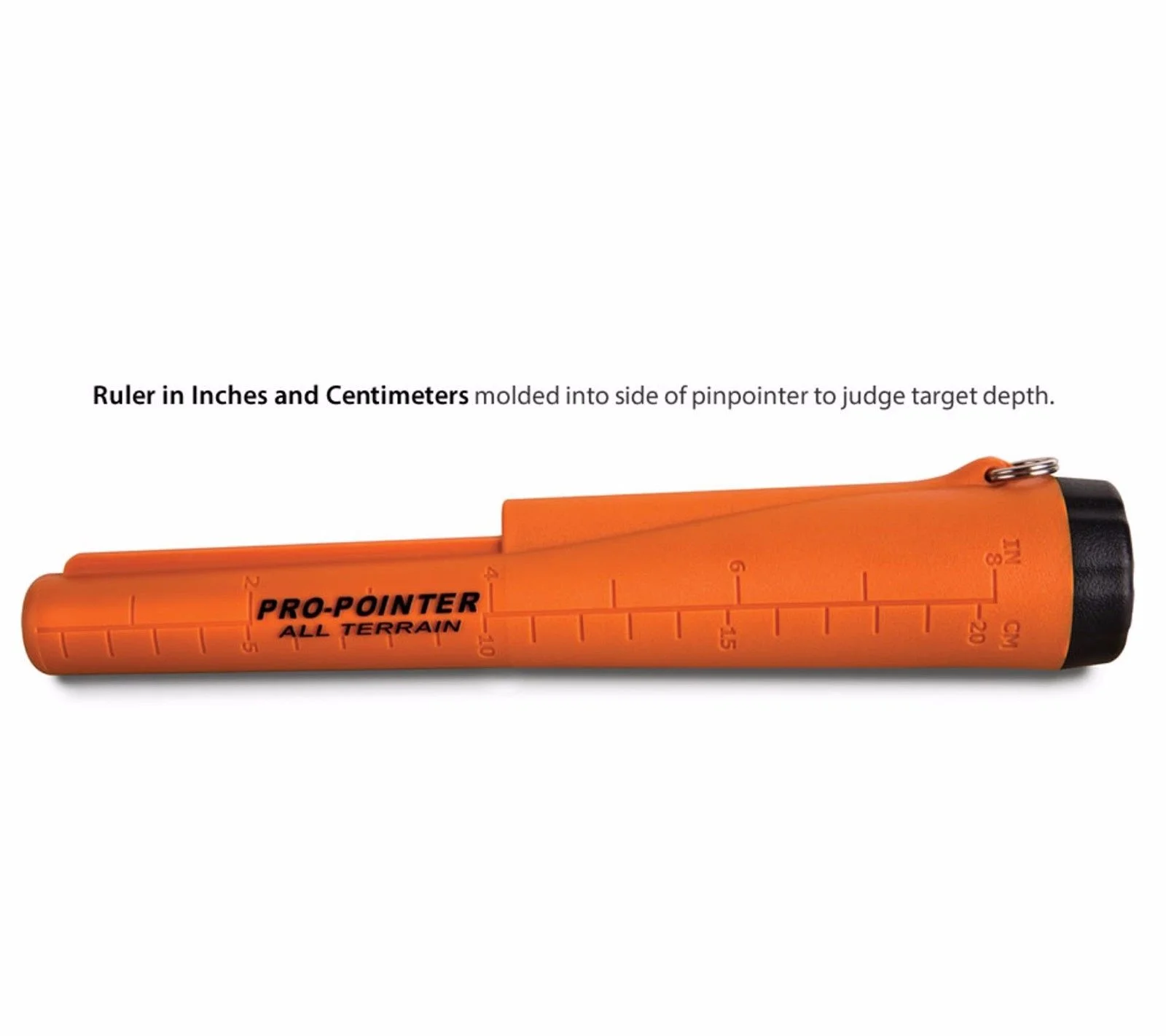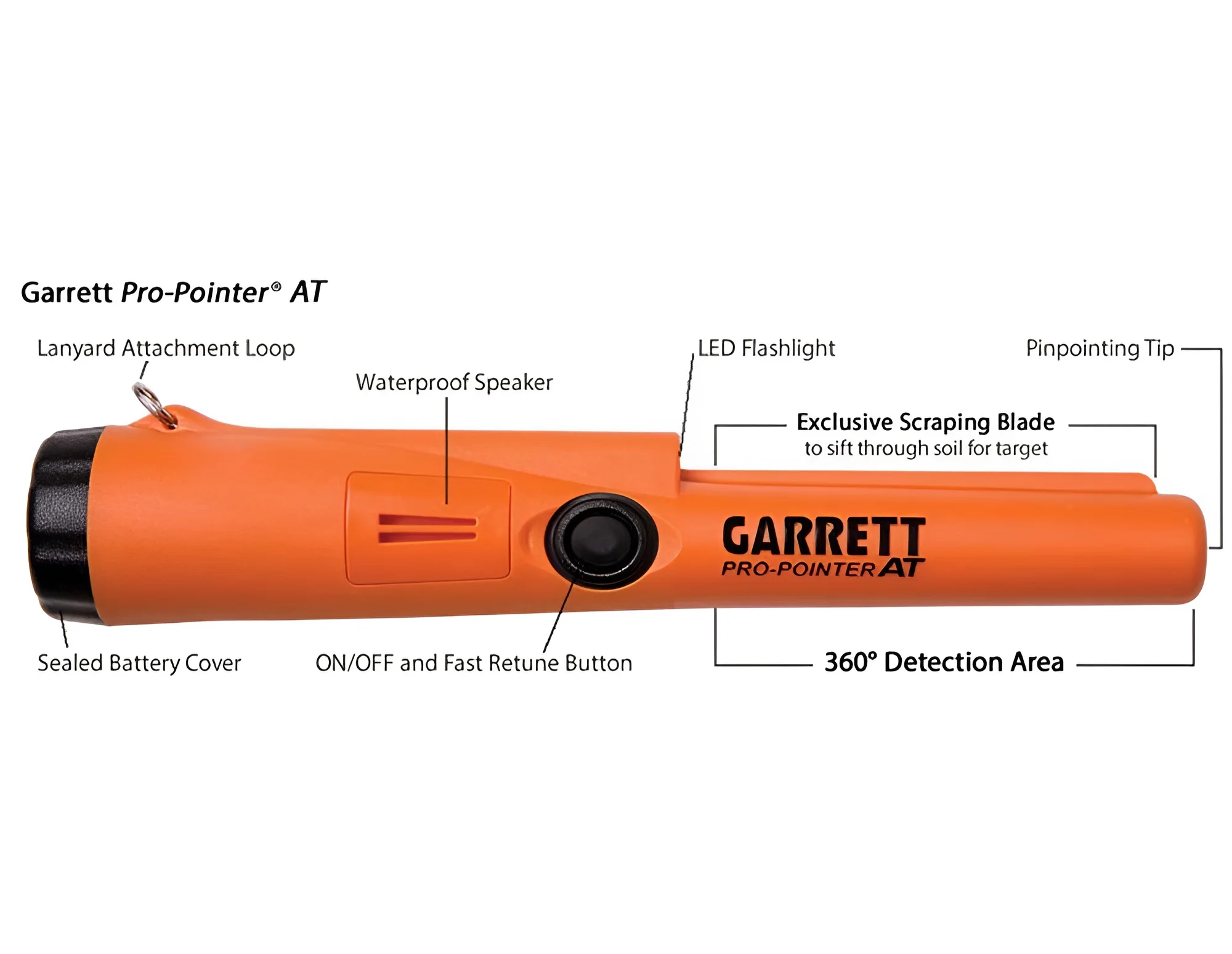 Garrett pro-pointer AT all-terrain waterproof pinpointing metal detector 1140900 the pro-pointer AT provides all-terrain versatility for locating and pinpointing metallic targets. It is environmentally protected from the elements and is fully submersible to a maximum depth of 10 feet or 3 meters. Pro-pointer AT Unique. Retuning allows users to quickly: Shrink the detection field to precisely pinpoint large targets tuned out of the mineralized ground, wet beach sand, etc. Help gauge target size and distance to help identify edges of large targets pinpoint multiple targets versus one large target signal pro-pointer alarm: After 5 minutes with no button presses, the pin pointer emits periodic warning chirps. Automatic power off after 5 minutes of warning chirps, saves batteries. Simple, single-button operation for power, retune, sensitivity adjustment, and stealth mode. Ruler in inches and centimeters molded into side of pin pointer to judge target depth. Lanyard attachment loop molded into side of pin pointer. The new power button is easy to operate even with gloves. Other Pro-pointer AT features: Patented proportional audio and vibration patented scraping blade for searching soil twice the battery life of other pin pointers with LED lights. Pinpointing tip and 360° detection area flashlight for low light uses. Includes woven belt holster and 9-volt battery. Large power button