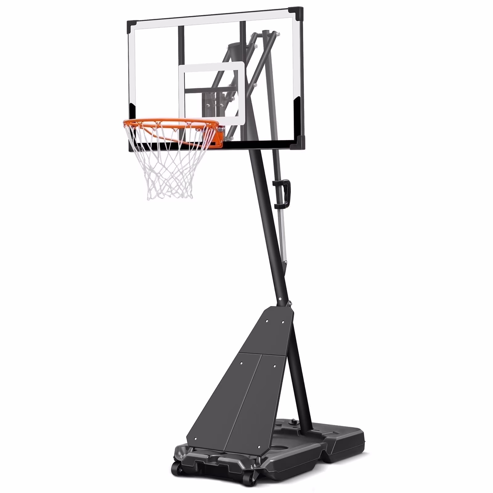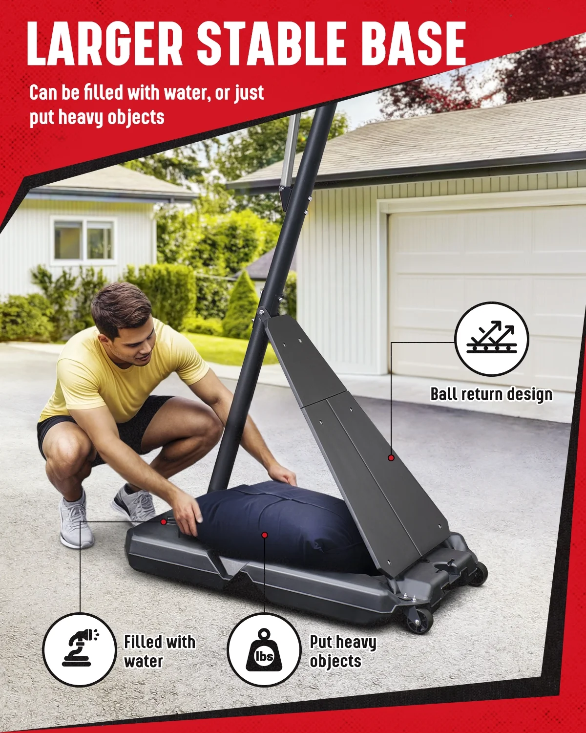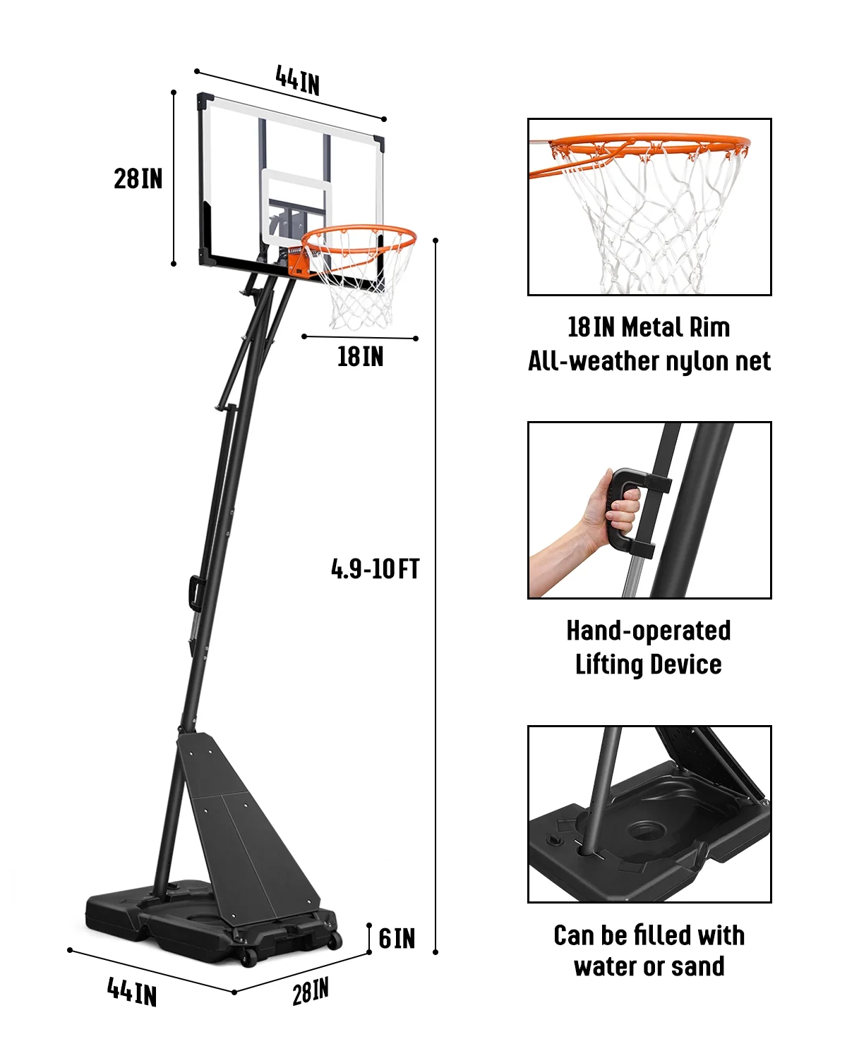- 【Stable Base and Structure】The high-strength PE material base has a large capacity, which can be filled with 48 kg water for stability and can also withstand the pressure of heavy objects such as sand bags. The triangular structure formed by the pole and the base can greatly increase the safety and prevent the portable basketball hoop from tipping over.