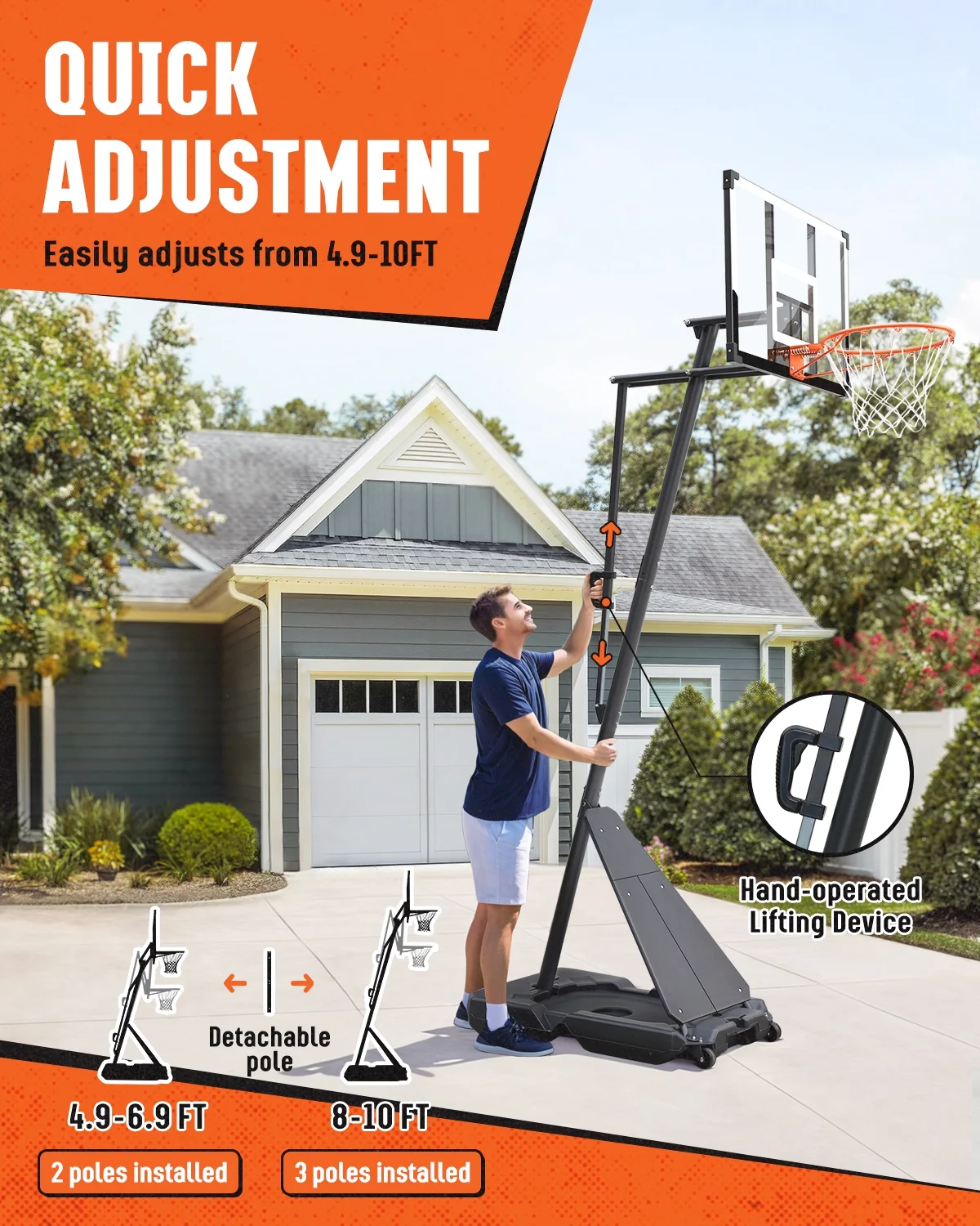 - 【One-button Adjustment, 4.8-10 feet】This basketball goal has a wide range of adjustment, from 4.8 feet to 10 feet. You only need to dismantle a pole to change the lifting range from 4.8-6.8 feet to 8-10 feet. One-button control of the lever can easily adjust the height and lock within the range (4.8-6.8 feet/8-10 feet), convenient and labor-saving. It can handle high-intensity games and training, and is also suitable for family activities, sports games, and school activities with family and friends.
