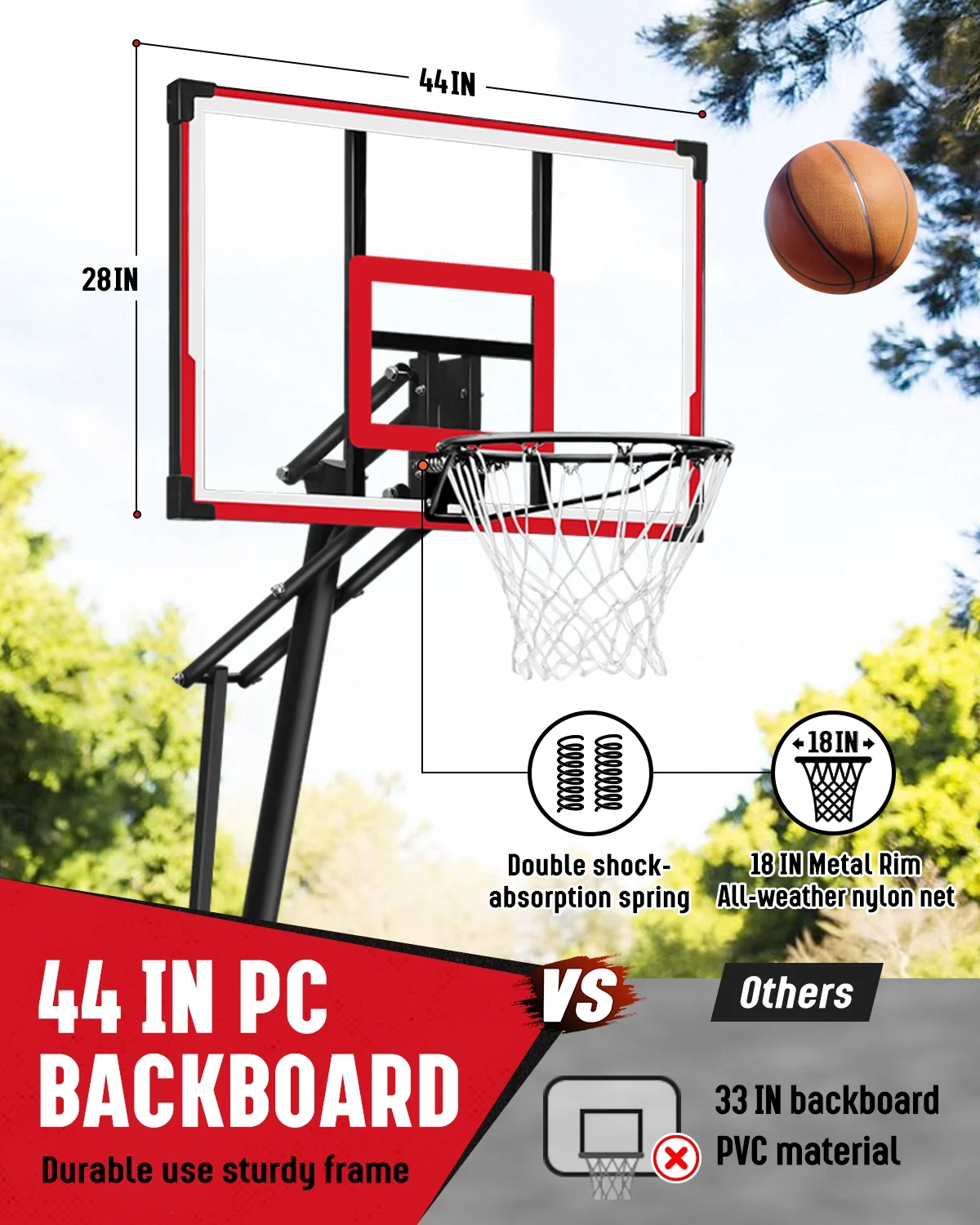 - 【Strong Shockproof and Sturdy】The shockproof rim suitable for standard size 7 balls is made of 16mm thick Q195 steel, equipped with 44 inches of super strong strength and high-strength windproof PC transparent backboard, which will avoid impact and fragmentation when dunking. All-weather nylon mesh is perfect for all seasons.