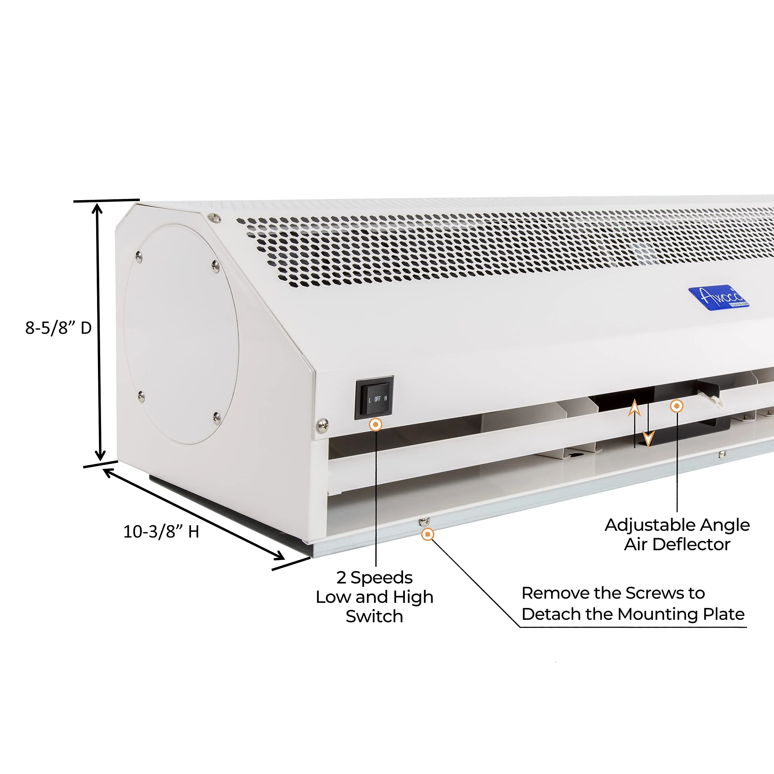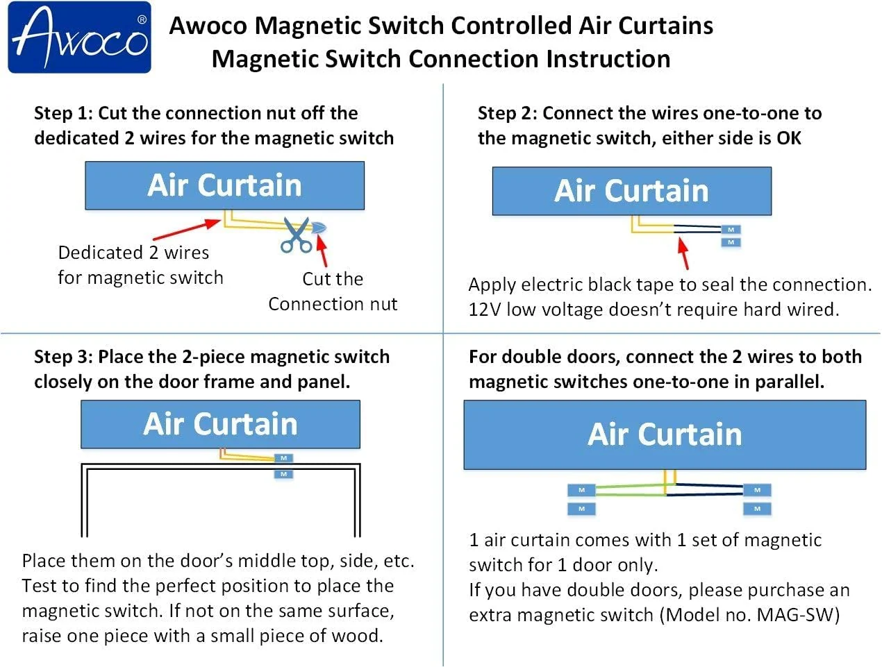 - Free Optional Door Switch: With the door switch installed. automatically turn on the air curtain when the door is open; turn off when door is closed. The door switch is optional. if you do not install the door switch. press the Lo/Off/Hi speed switch to turn on for 8 hours continuously running.