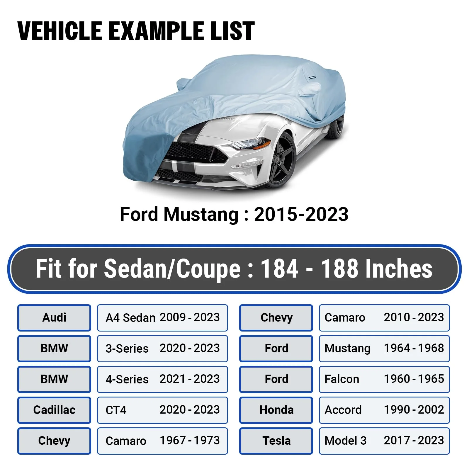 - Perfect Fit: Tailored for vehicles measuring 184-188 inches. such as Audi A4. Ford Mustang. Chevy Camaro. Honda Accord. and Tesla Model 3. Experience a snug fit with our portable. full exterior covers. Suitable for sedans. coupes. convertibles. and hatchbacks.