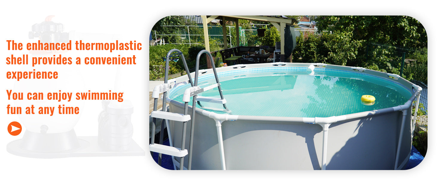 - Durable Motor and Material: Our sand pool pump has a copper wire motor that features overload protection for long-lasting running and extended service life. It's built with reinforced thermoplastic housing. making it portable. corrosion-proof. and ideal for promoting clean water quality all day long.