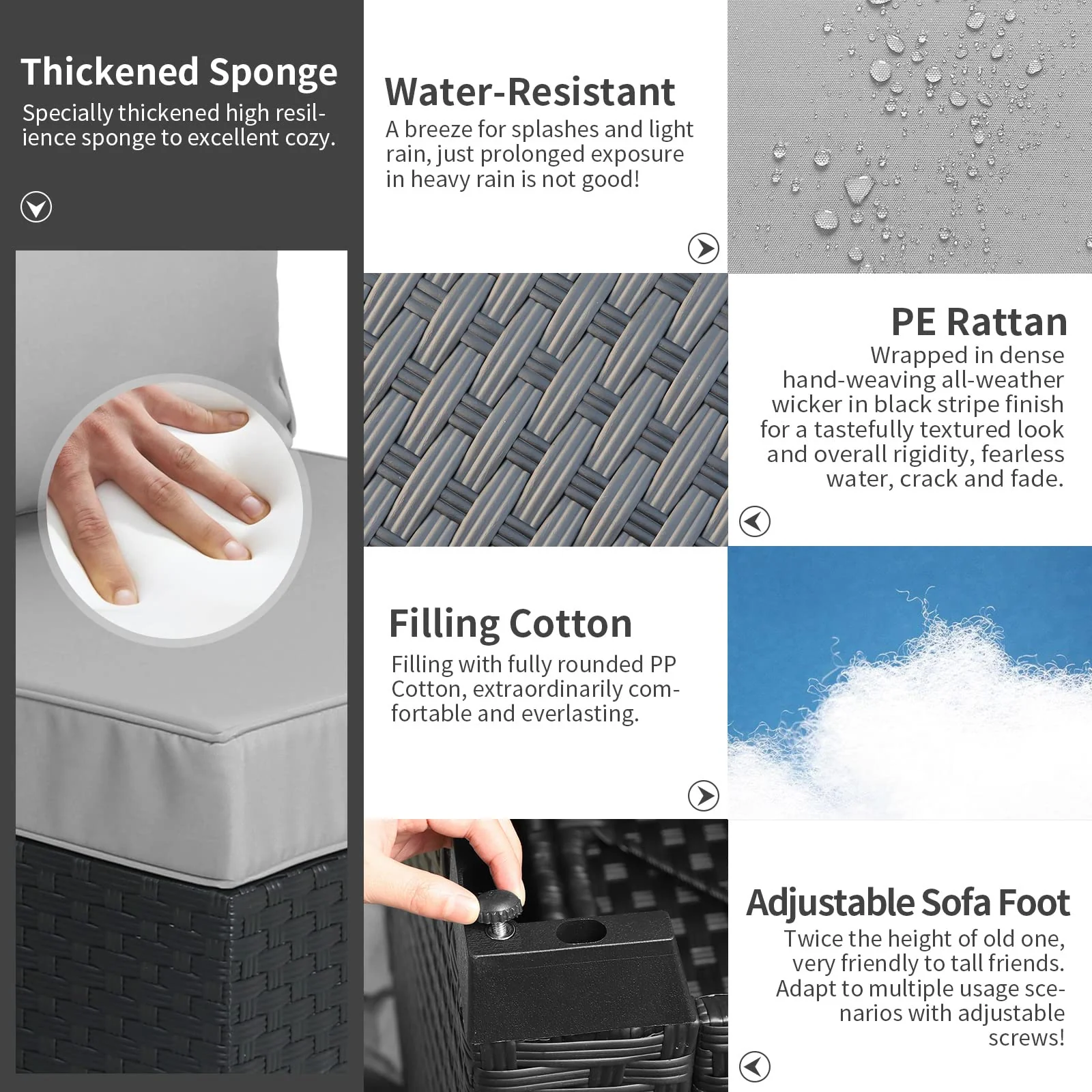 Material: steel frame. high-density polyethylene(HDPE) wicker. high resilience sponge. 250g polyester fabric