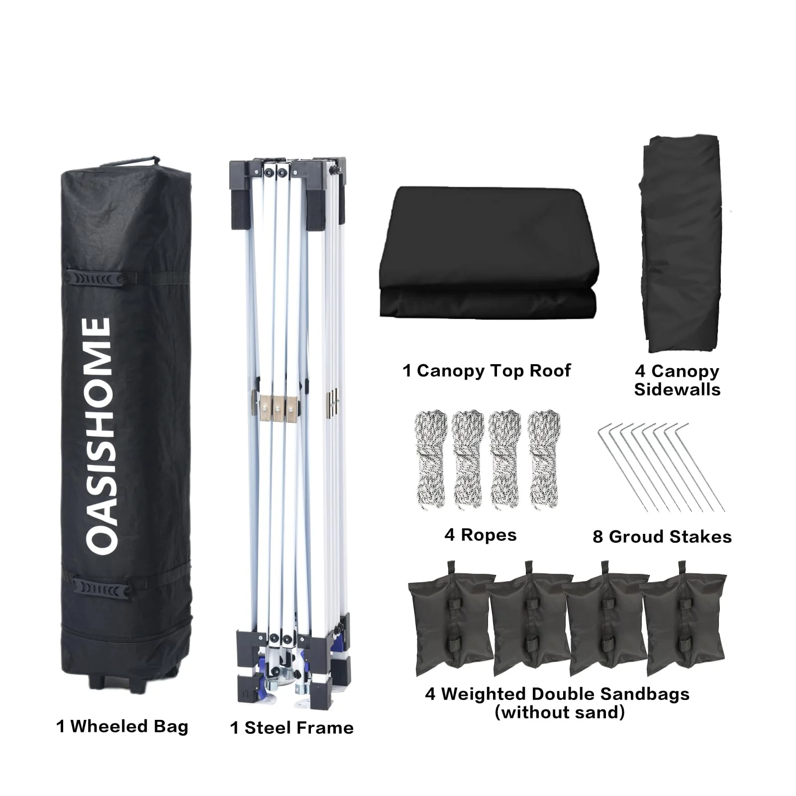 - What is included. 10x10 Ft pop-up frame; 10x10 Ft top roof; 4 removable high-density fabric sidewalls. 2 of that are with zippers as doors. and 2 of that are with windows for view; bonus 1 upgraded durable wheeled roller bag; 4 sandbags; 8 tent stakes; and 4 ropes