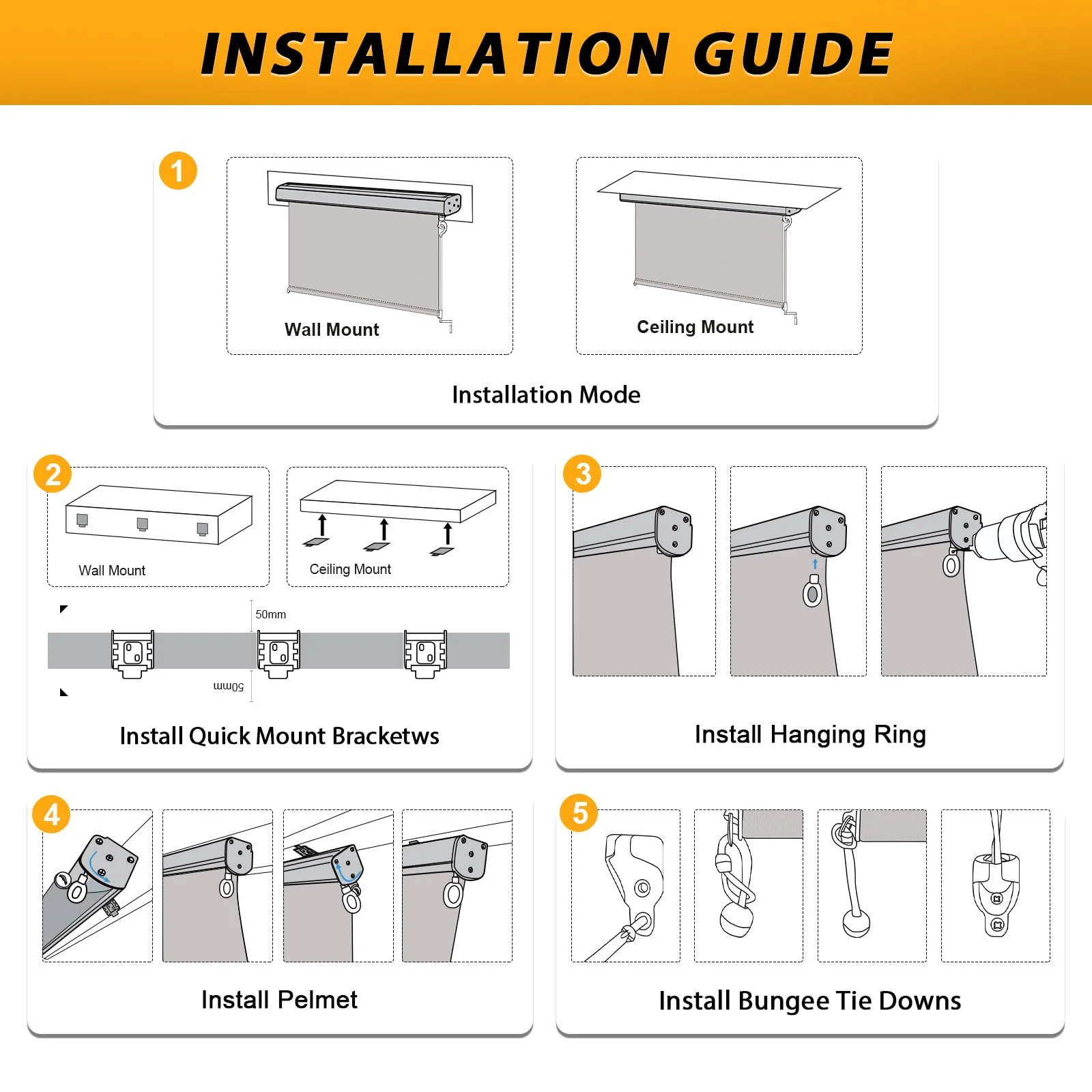 - ��Easy to Install�� Package come with all the necessary accessories and step-by-step instructions. and also have installation videos for quick and easy setup so you can enjoy your outdoor scene with ease.Set includes 8 drywall plastic anchors. 8 classic 304 stainless steel screws. 2 durable roller brackets. 2 durable bungee brackets and 2 beautiful bungee cords ensuring stress-free installation and scene enhancement. If anything is missing. please let us know and we will take care of it for you.