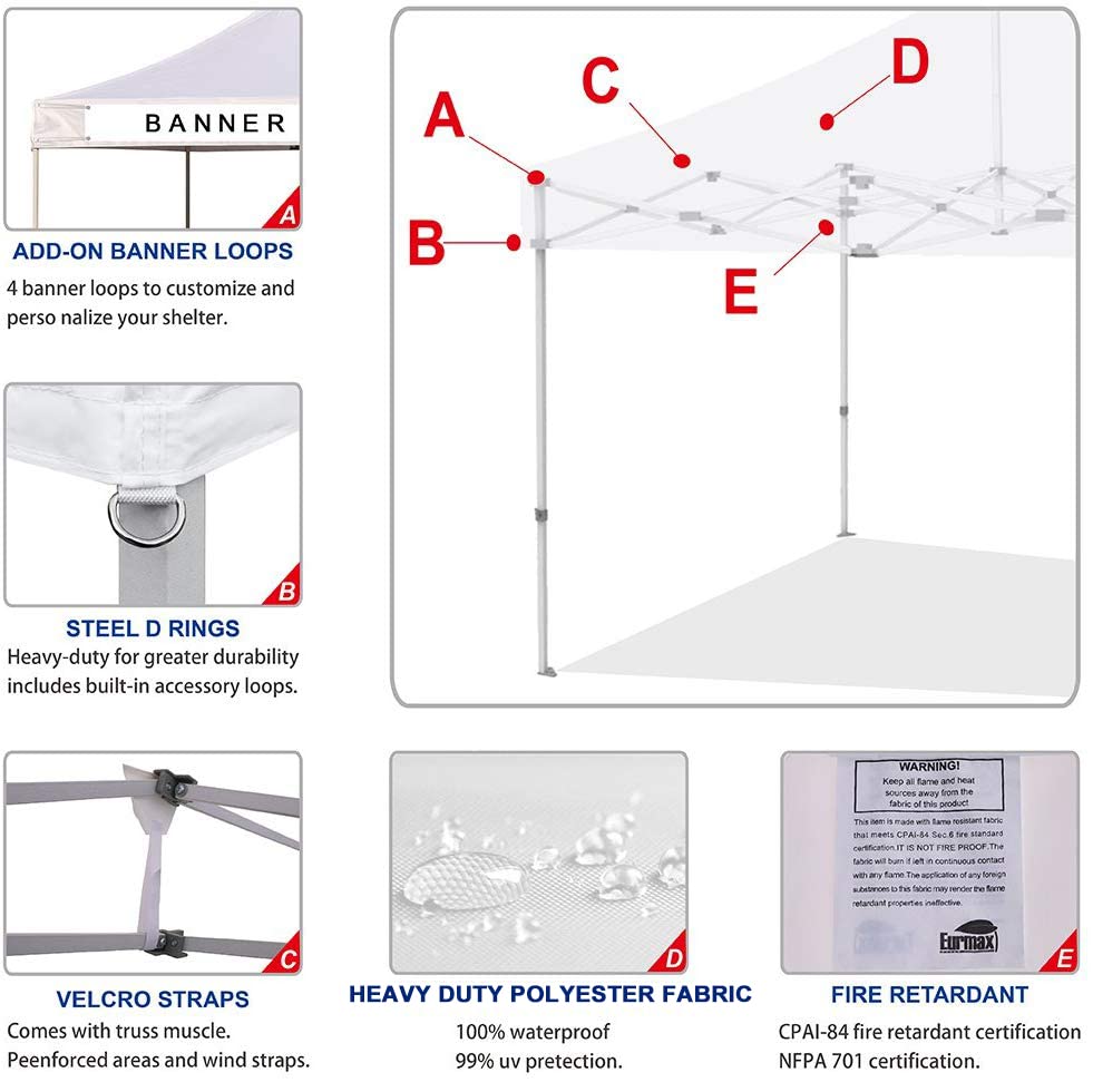 - Extra thick heavy duty polyester fabric. CPAI-84 fire certification. 99% UV protection and UPF50+ rated and WATER PROOF.Banner loops sewn on the front valance to hang your banner.