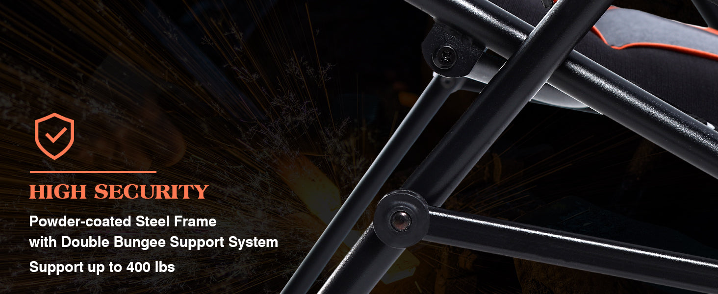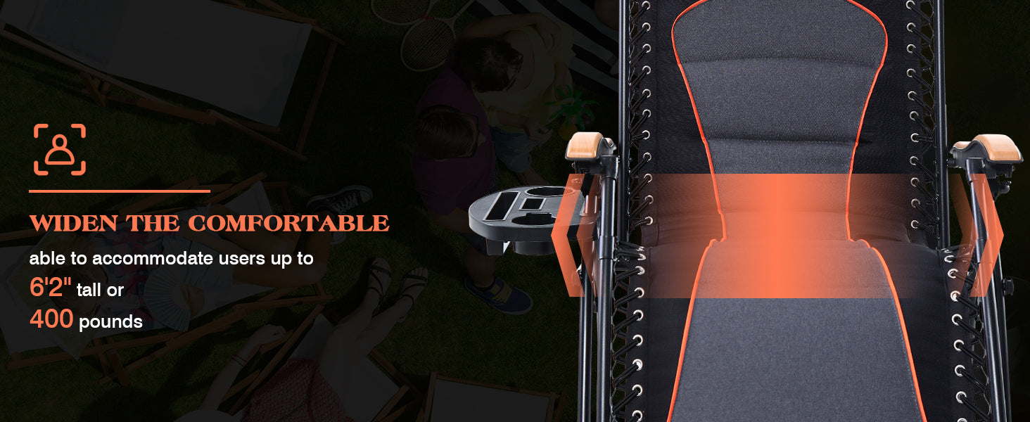 - Zero Gravity Reclining Chairs: The Length of extra long chair when fully reclined is large enough for big and tall people 6'2. Strong double bungee rope and stainless steel tube frame are durable for using a long time. The maximum loading capacity is 400lbs