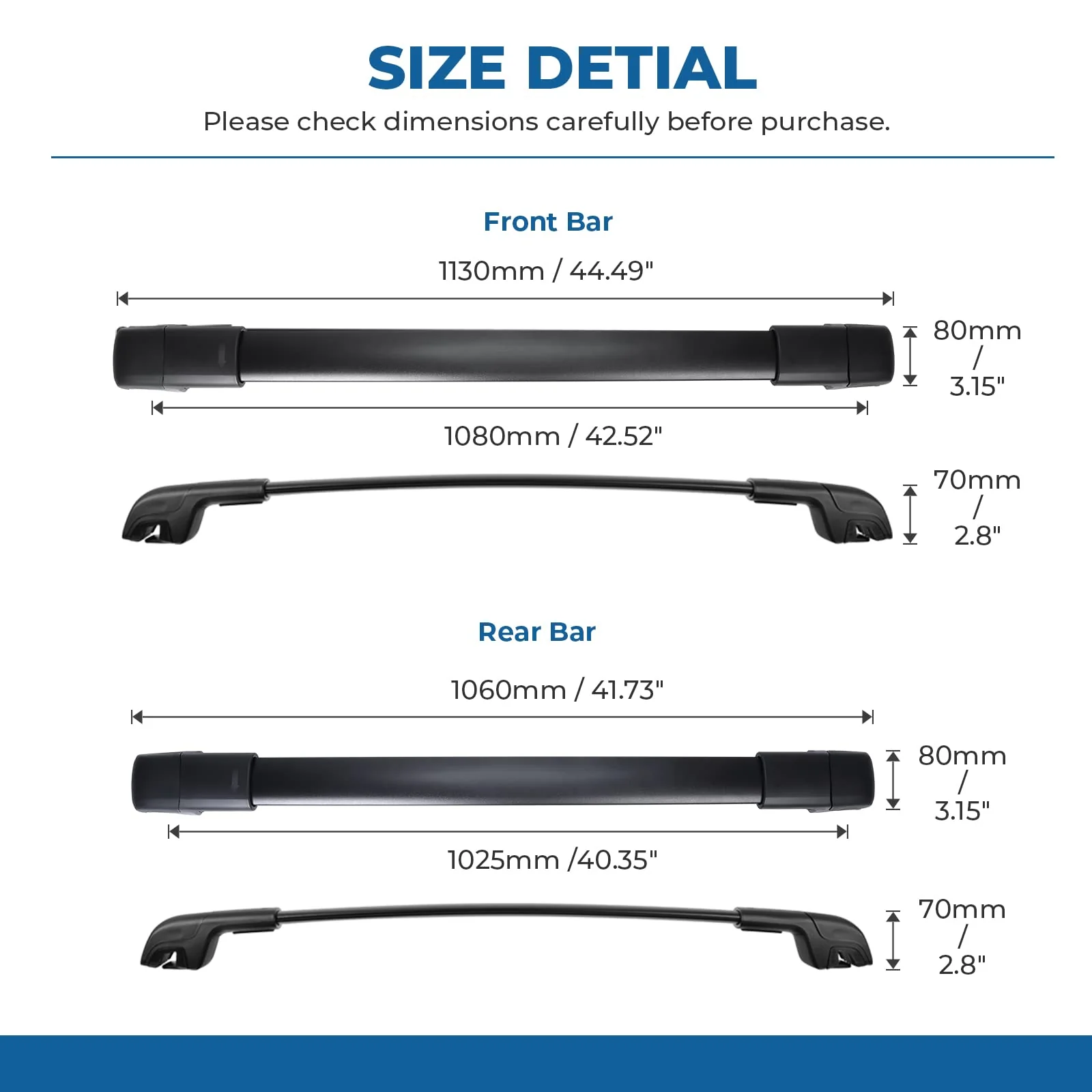 • ��Easy To Assemble In Minutes��The front crossbar is longer than the rear to accommodate vehicle size. The mounting rack is installed and secure with a screwdriver that easily attaches to roof mounts without drilling. Please read the installation manual before installing.