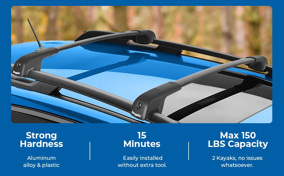 • ��Bring You Security & Durability��BougeRV roof rack cross bars are upgraded with locking features for security and are made from high-grade aluminum. base feet are made of high-quality plastic. Aluminum is on average 30% lighter than steel. Our roof rack crossbars can withstand greater stresses than the best all-steel roof rack at 1/3rd less the weight.
