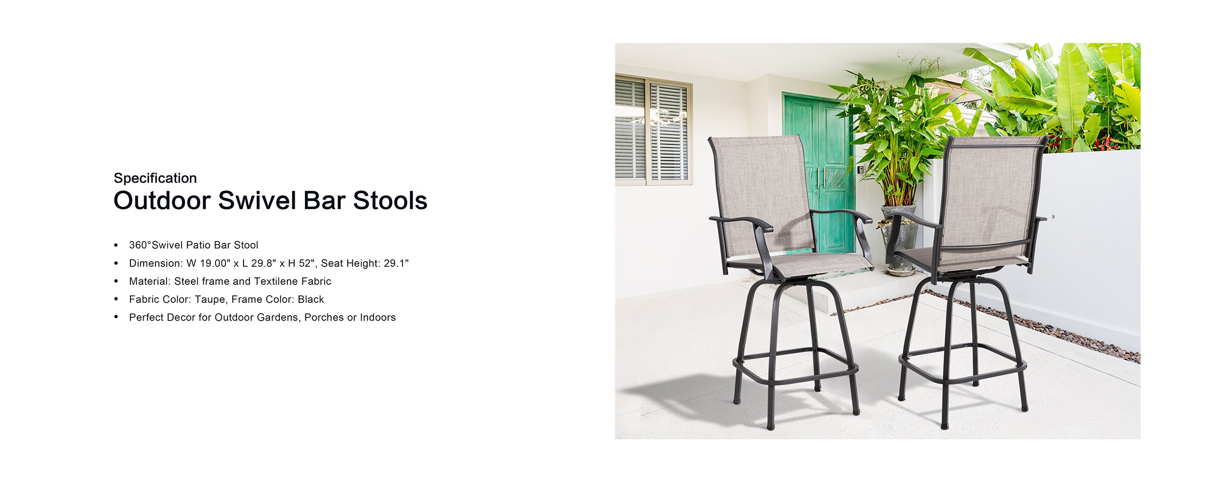 - [Overall Dimension: Swivel Bar Chairs]: W 19.00 x L 29.72 x H 51.77. Seat Height: 29.1. 2 bar stools included. suitable for outdoor garden. lawn. terrace. pool. coffee time. as well as indoor kitchen. living room dinner time.