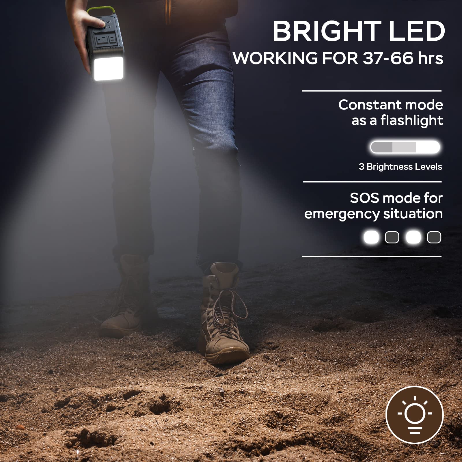 - EMERGENCY LIGHTS: This portable generator is built with a 3-level brightness LED flashlight. which could emit 2 lighting modes (steady light and flashing light. SOS mode) to meet your different needs. Press the LED flashlight switch to change the brightness and SOS mode. When you go out camping or experience power outages. this power supply can always help you out.