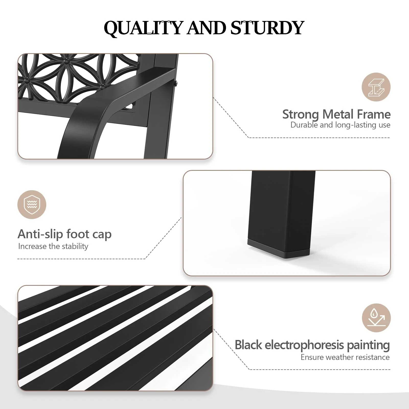 • Quality and Sturdy: The 50-inch metal outdoor bench is made from high-quality metal that is built to last. It is weather-resistant and can withstand the elements. making it the perfect choice for outdoor use. The legs are equipped with anti-slip foot caps make the bench more stable to use
