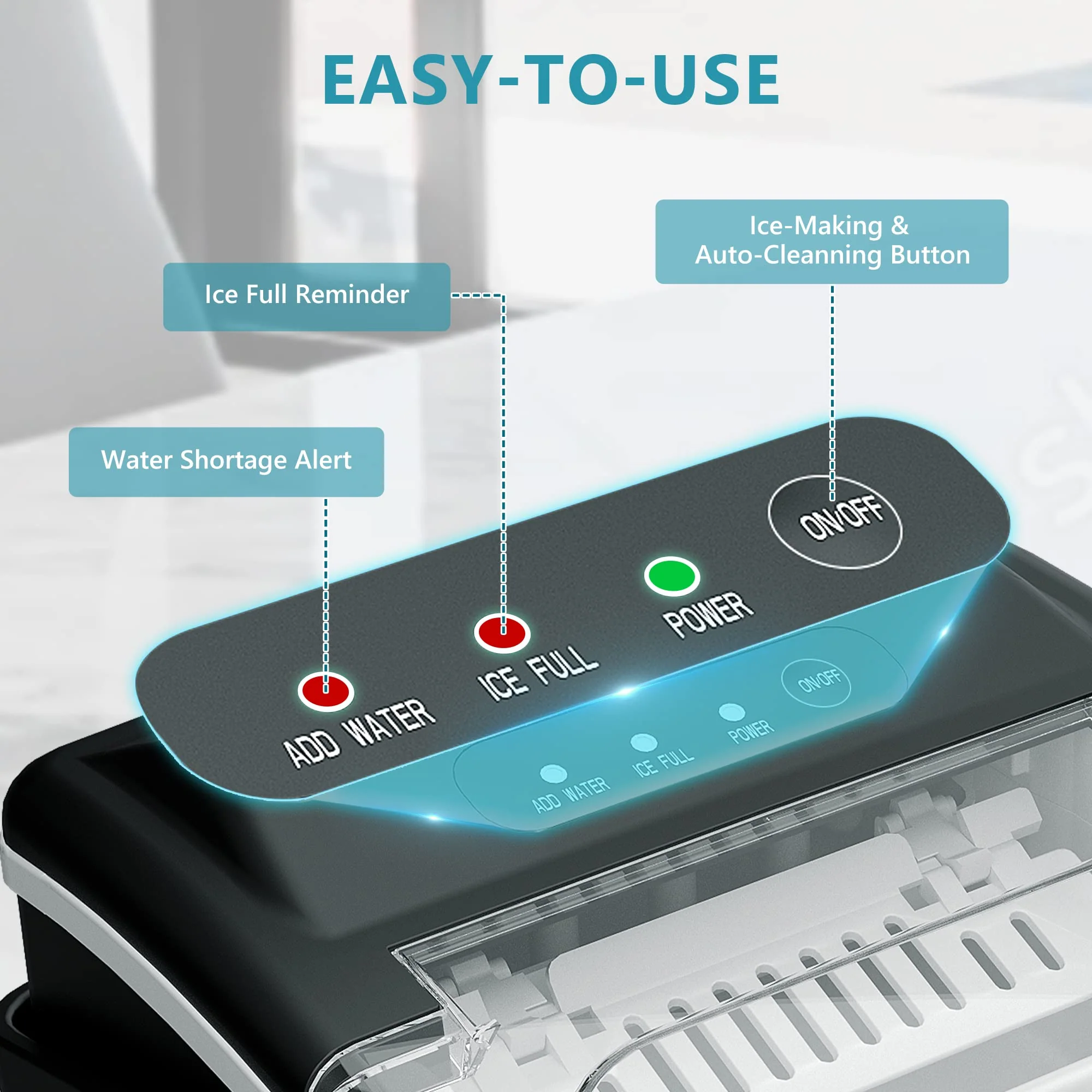 • Smart Operation & Self-Cleaning: The ice maker has advanced infrared sensor. The ICE FULL indicator flashes remind you to take out ice to prevent overflowing when the basket is full. And it'll remind you to add water by flashing ADD WATER. Additionly. the compact ice maker has a one-touch auto-cleaning function. Press the ON/OFF for 5s after adding water to run automatic mode for 30mins. Not only are your hands-free but also you get a clean ice maker.