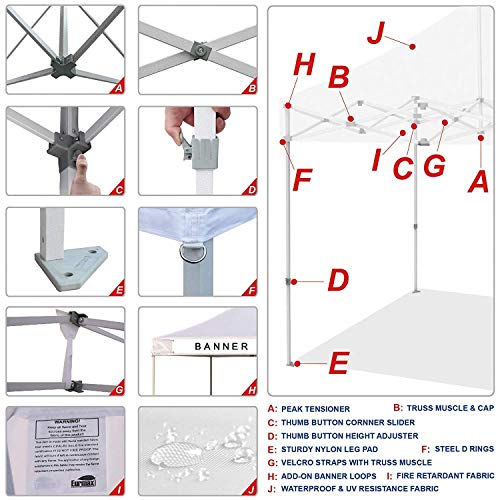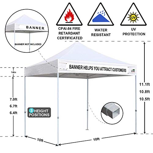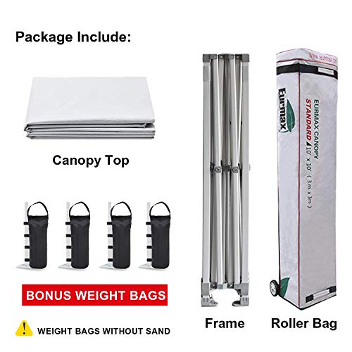 - ?The package includes: 10x10 Pop up canopy frame + Canopy tent top cover + Canopy tent roller bag + Bonus 4 canopy weights bags. NO STAKES!! Ez pop up 10x10 canopy for party. parties. picnics. market stall/market trade show or any outdoor events.Top front valance with 4 name banner sleeve to customize and personalize your shelter. Help you attract customers.Eurmax commercial canopy tent suitable for both sunny and rainy days.