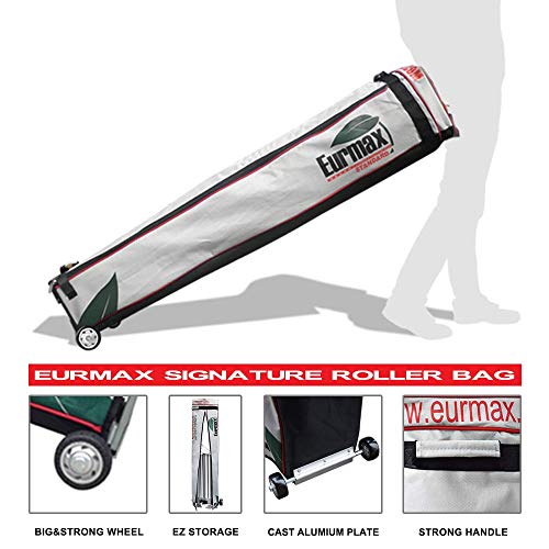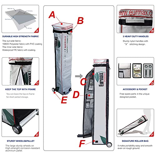 - ?10x10 Canopy tent fabric: CPAI-84 fire retardant certificated 500 denier polyester PU coated to block about 99% UV rays.Stitching lines are all seam sealed to prevent water penetrate from seames to make our canopy tent waterproof.?The canopy tent roller bag:Eurmax unique L shaped roller bag is oversize designed.it is easy to put frame and top in th bag.Big wheels.1680D strong polyester.2 layers fabric sewed.reinforced handles.all these makes the bag long lasting.