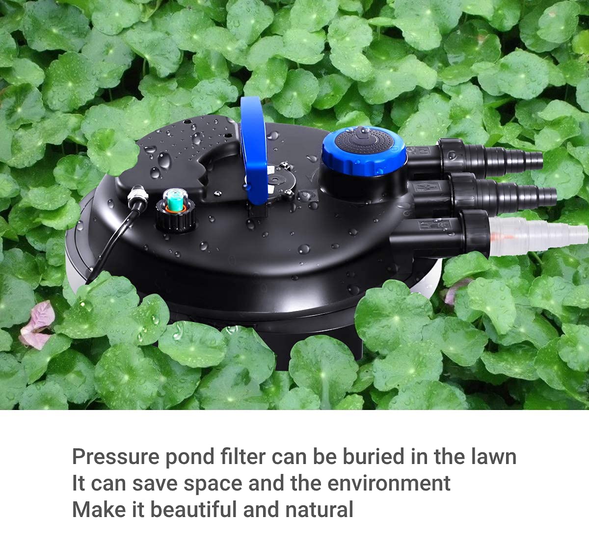• ��Easy to Clean Your Pond�� This pressure filter is an effective sealed pressure filter system which uses biotechnology to keep your pond clean and healthy. The convenient handle allow for easy relocation. you can place it on the land or in the water.