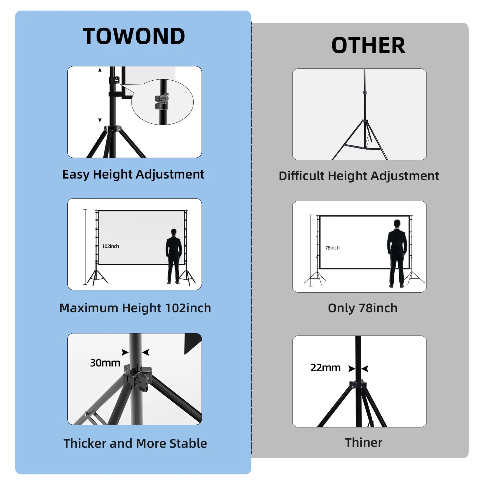 • Projector Screen with Stand. 150-inch diagonal. 160��wide viewing angle. aspect ratio 1:1 and 16:9 4k HD portable projector screen is made of high quality natural polyester fiber. Towond projector screen offers sharp and bright images. Thick and anti-crease design giving you more fun. even support FRONT and REAR projection.