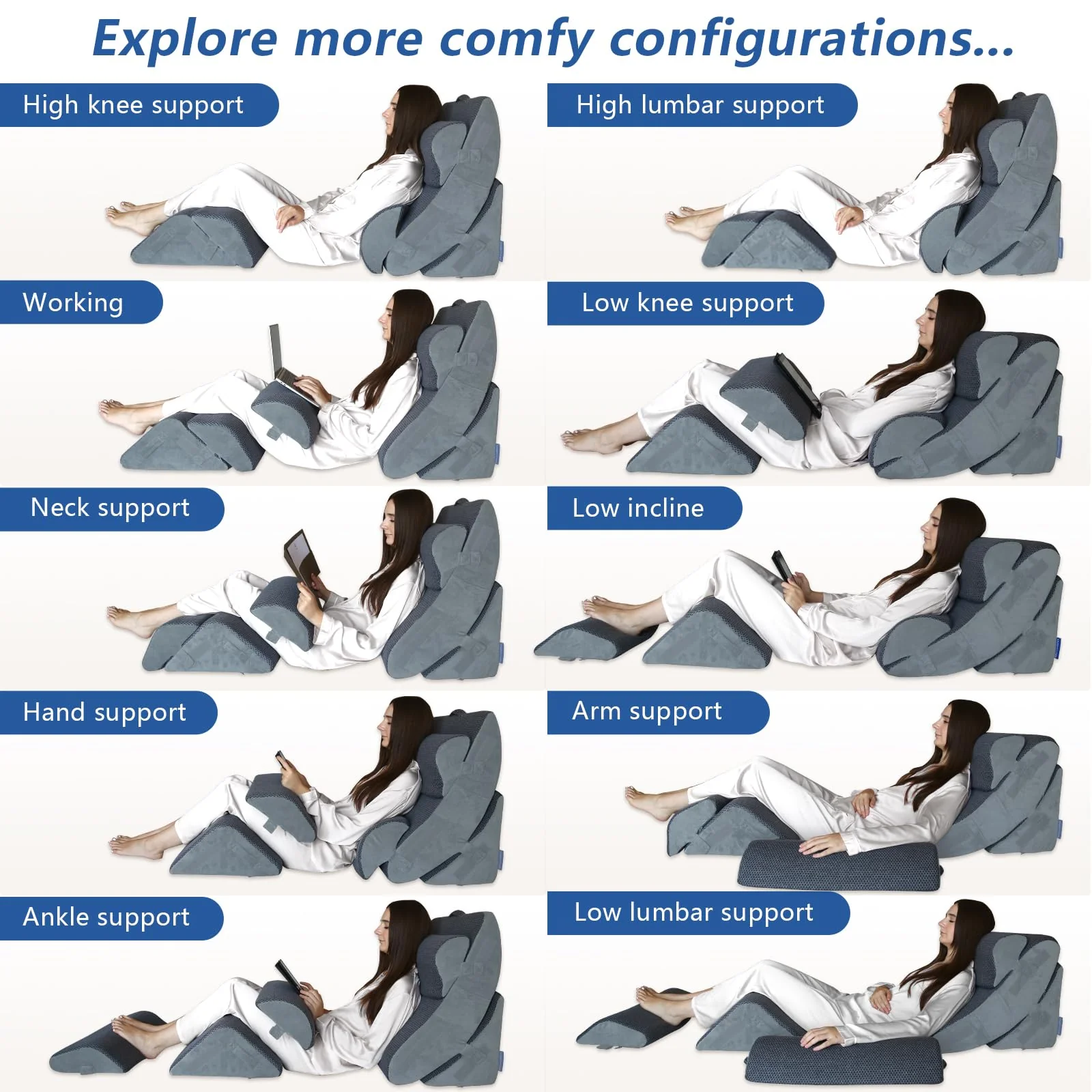 - ��Soft & Supportive Gel Memory Foam��The back pillow. lumbar pillow and the head pillow of the wedge pillow set are made of soft memory foam with gel particles. which ensures comfortable and refreshed even with prolonged use. The base pillow. leg pillow and knee pillow are made of high-density foam. which provides sufficient support and will not deform after long-term use.