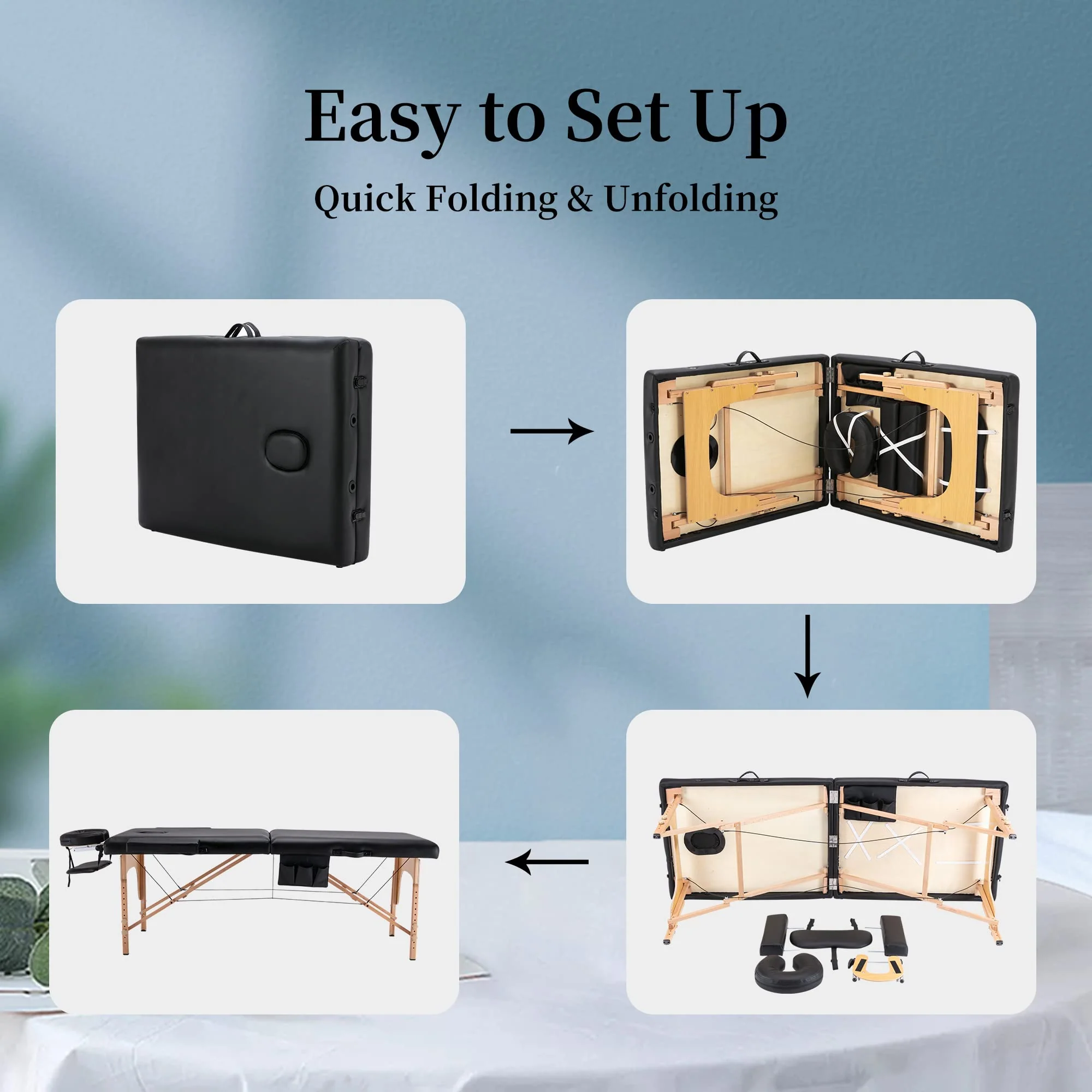 - ��Easy to Set up��: This massage bed can be easily set up. It only need one or two minutes to set up and only have a few steps. It does not require any tools. All we had to do was open the massage bed from the middle and the legs automatically fell into place. Massage table quick installation method saves valuable time.