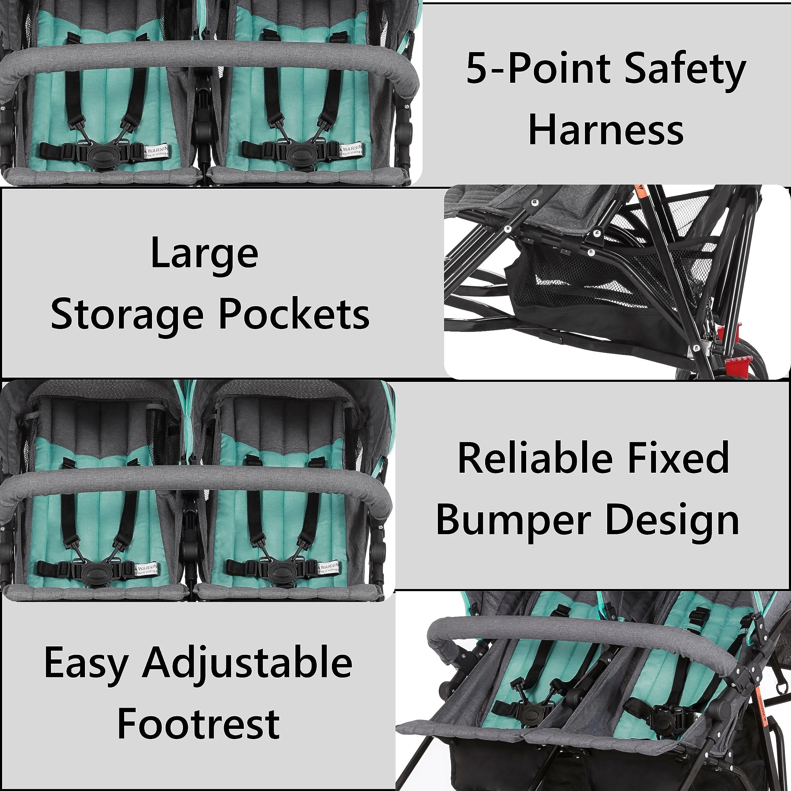 - SAFE & SECURE: The seats have 5-point adjustable harnesses with a comfort strap. Front swivel wheels allow 360�� maneuverability. while rear wheels can be locked for stability. Soft Ride wheels mean less pushing effort and a smoother ride for the kids