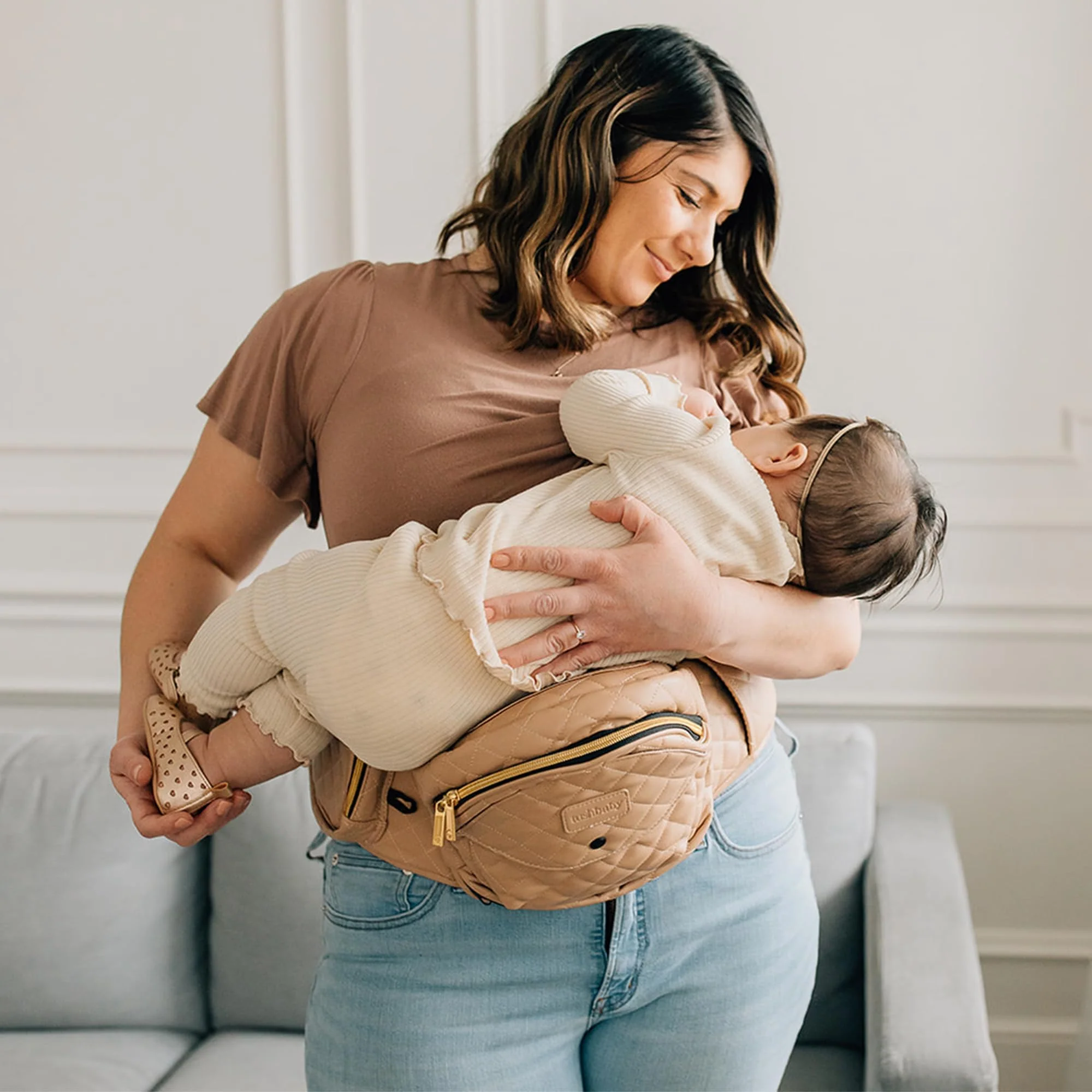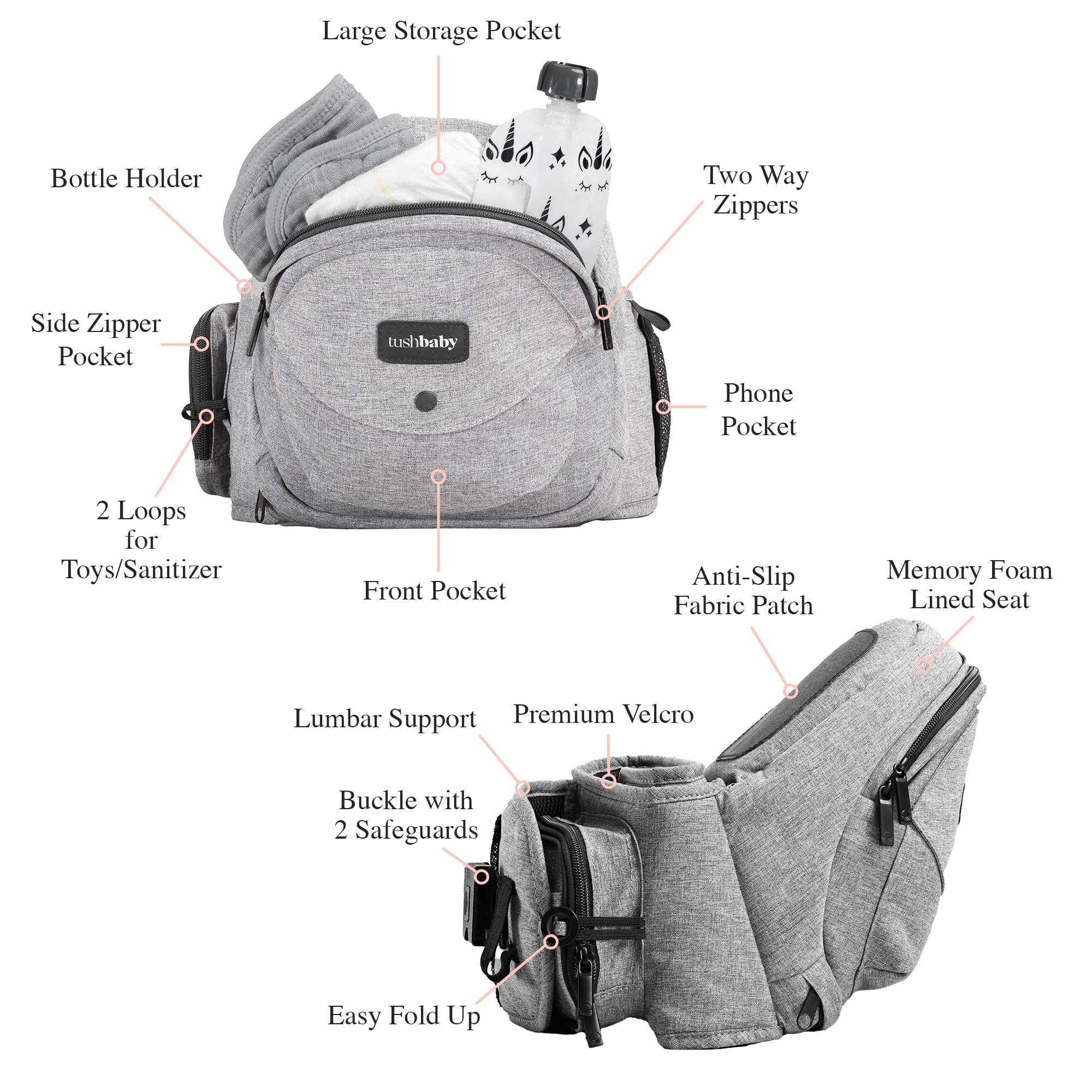 - MULTIPLE STORAGE POCKETS: TushBaby doubles as a diaper bag with large storage pockets. Throw diapers and wipes in the storage beneath the seat. Access your keys. phone. and pacifiers in the side pockets. Store a bottle in the holder. Attach toys & sanitizer to the loops. And fold it right up for easy transport. Leave your stroller. clunky carrier. purse. and diaper bag in the minivan.