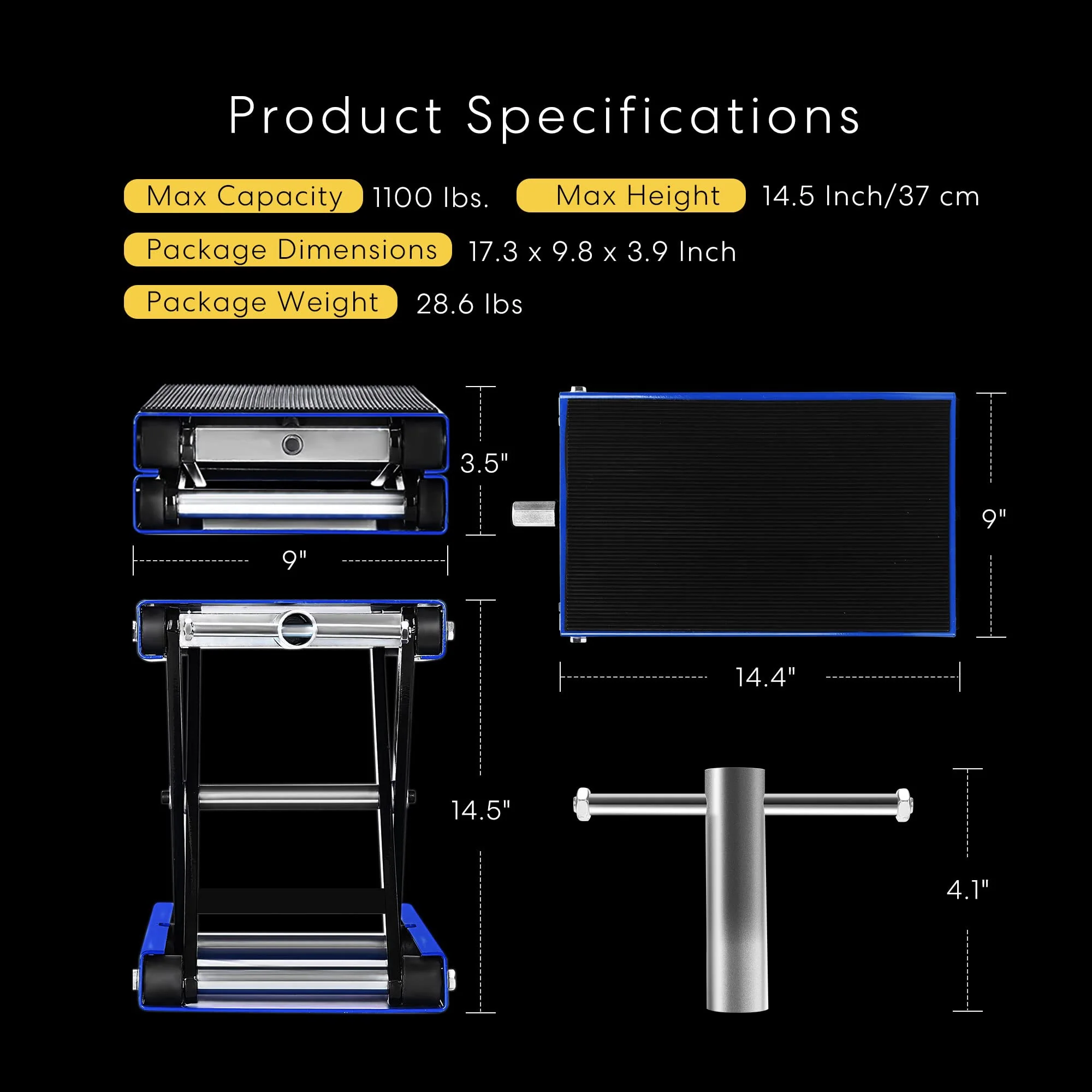 • ANTI-SLIP DESIGN - The top surface of the stand has a durable rubber pad with striped pattern to help prevent slippage and scratches; The wide top platform measures 14.4 x 9. which has a large contact area with the motorcycle to raise and lower it steadily