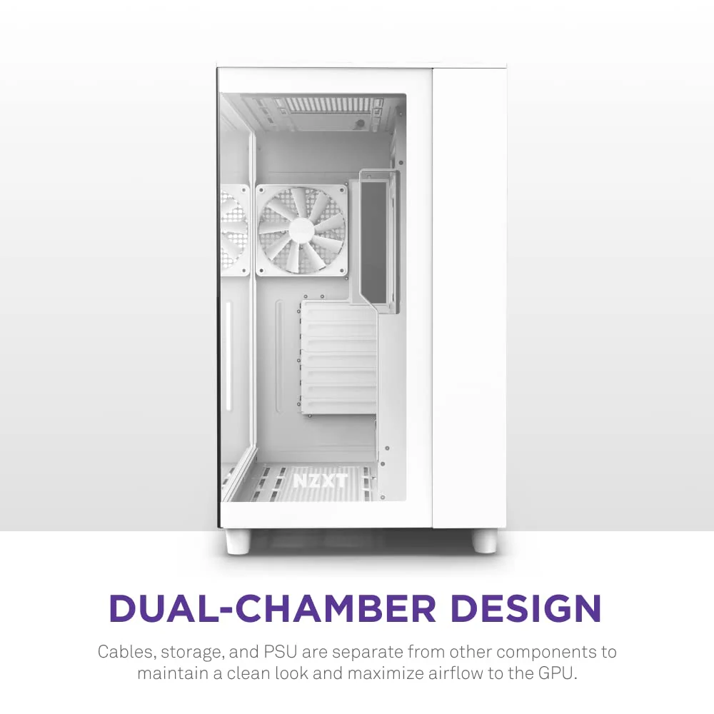 - DUAL-CHAMBER DESIGN: Cables. storage. and PSU are separate from other components to maintain a clean look and maximize airflow to the GPU.