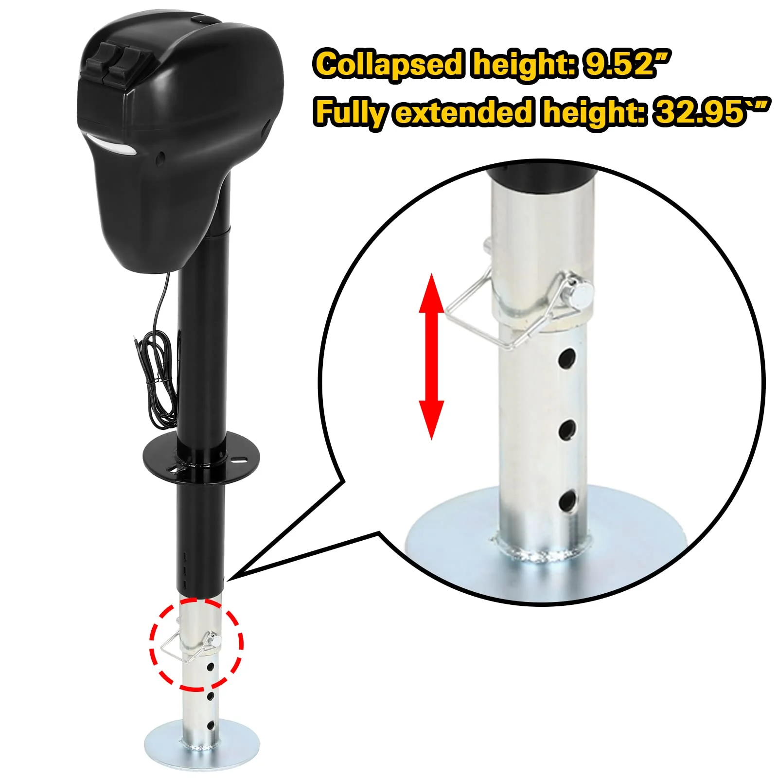 • WEIZE electric jack lets you raise and lower your A-frame trailer quickly and easily. 5000 lbs. lift capacity. a low maintenance 12V DC electric gear motor. Provides 18'' lift. retracted 10-1/2 inch. extended 29-1/2''. drop leg extra 5-1/2'' lift. Outer tube dia.: 2-1/4''. inner tube dia.: 2''.