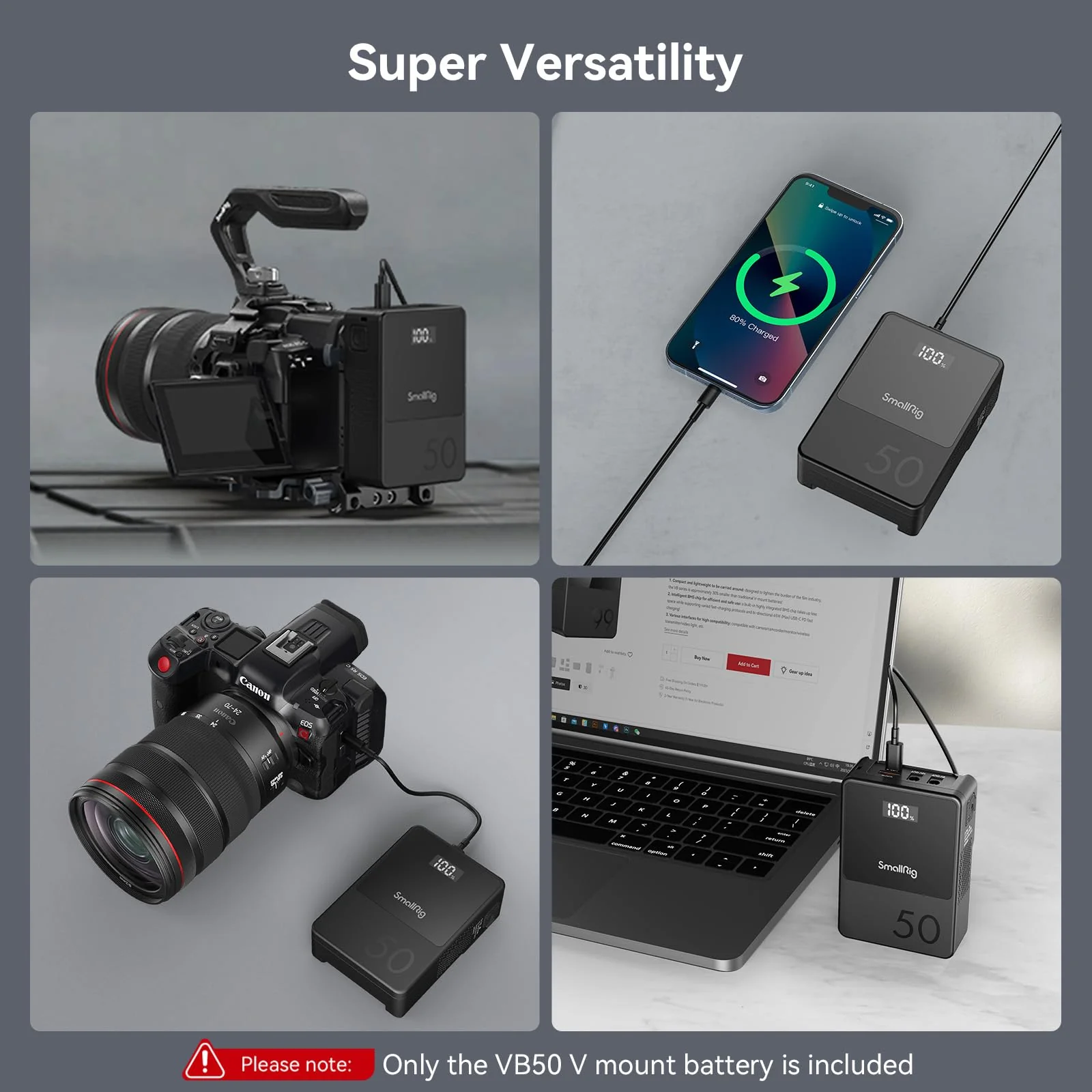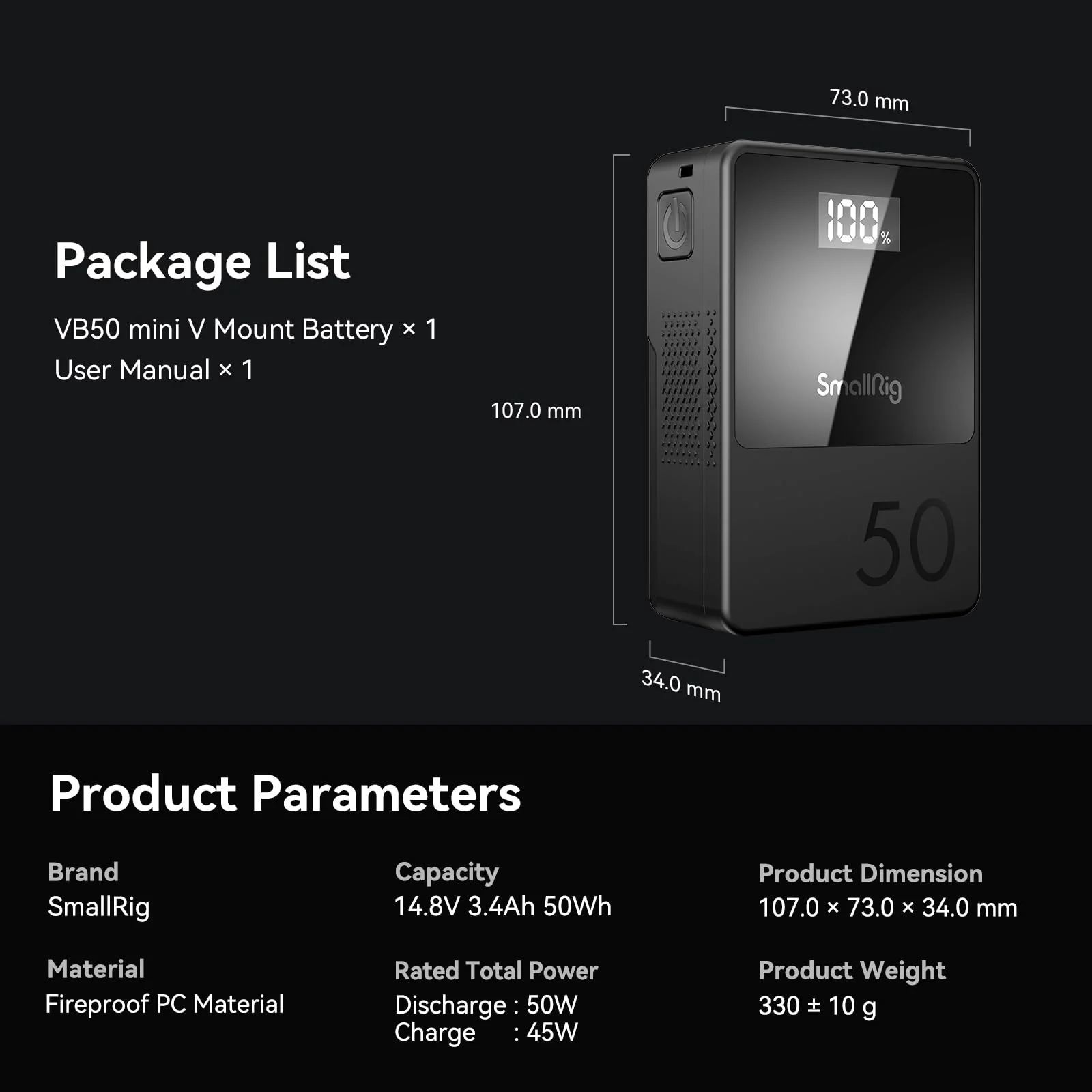 - High Capacity Battery: SmallRig V mount battery with high capacity of 3400mAh (50Wh/14.8V). built-in premium Li-battery to bring powerful battery life for long video making and photography projects. good power backup solution for photographers and filmmakers. Apart from this 50Wh battery. We also have 99Wh V mount battery 3580(Asin: B0B6Z9K42P). VB99 Pro 99Wh V mount battery 4292(Asin: B0CLGQDFCG). and 155Wh V mount battery 3581(Asin:B0B6ZCNF1P). meet your needs for different capacities.