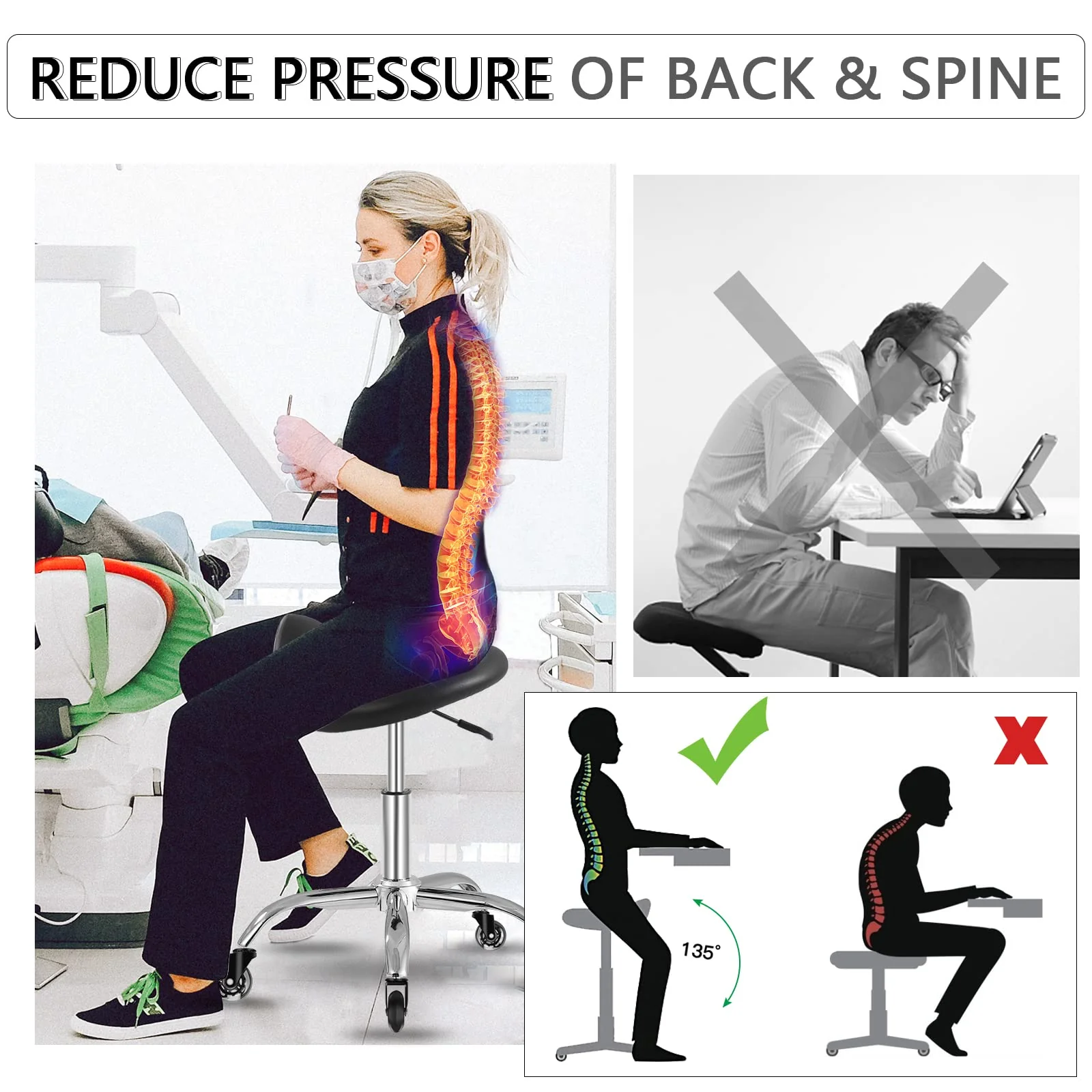 - ��Relieve Back and Hip Stress��Ergonomic stool is designed to redistribute the accumulated stress on your hips and strengthen your core muscles to restore your spine to its natural S-shape. This natural position provides maximum core strength. Let your body work more efficiently.