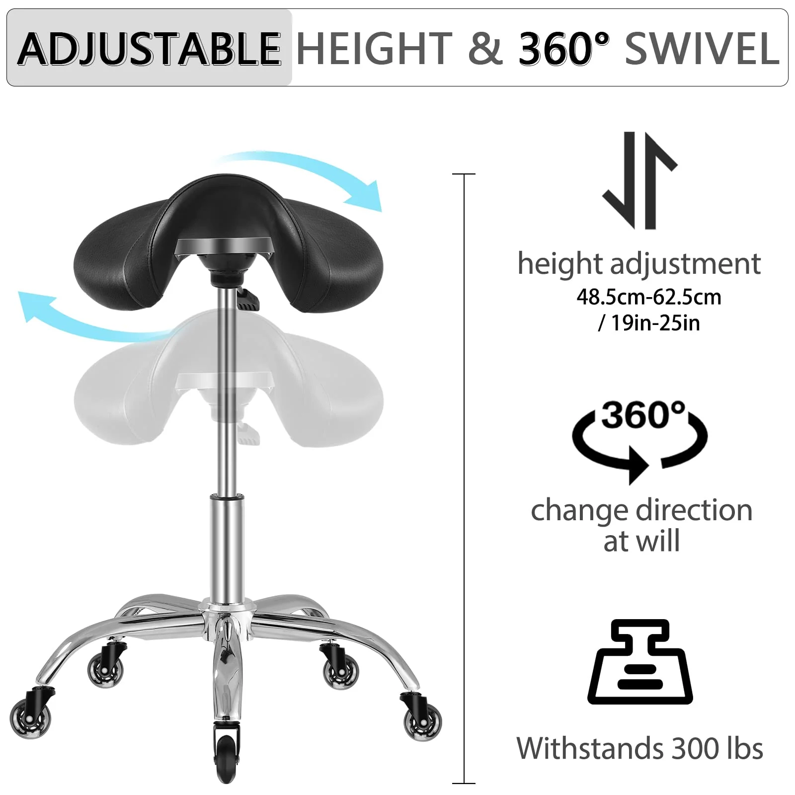 - ��Adjustable to Relieve Knee Pressure��The adjustable height stool is equipped with a first-class hydraulic lift cylinder. Adjustable height from 19 to 24.5 to accommodate people of different heights. And makes the seat 360�� rotatable. ideal for home use and workplaces such as spas. salons. laboratories. clinics. doctors. massage therapy. dental and other medical offices. etc.