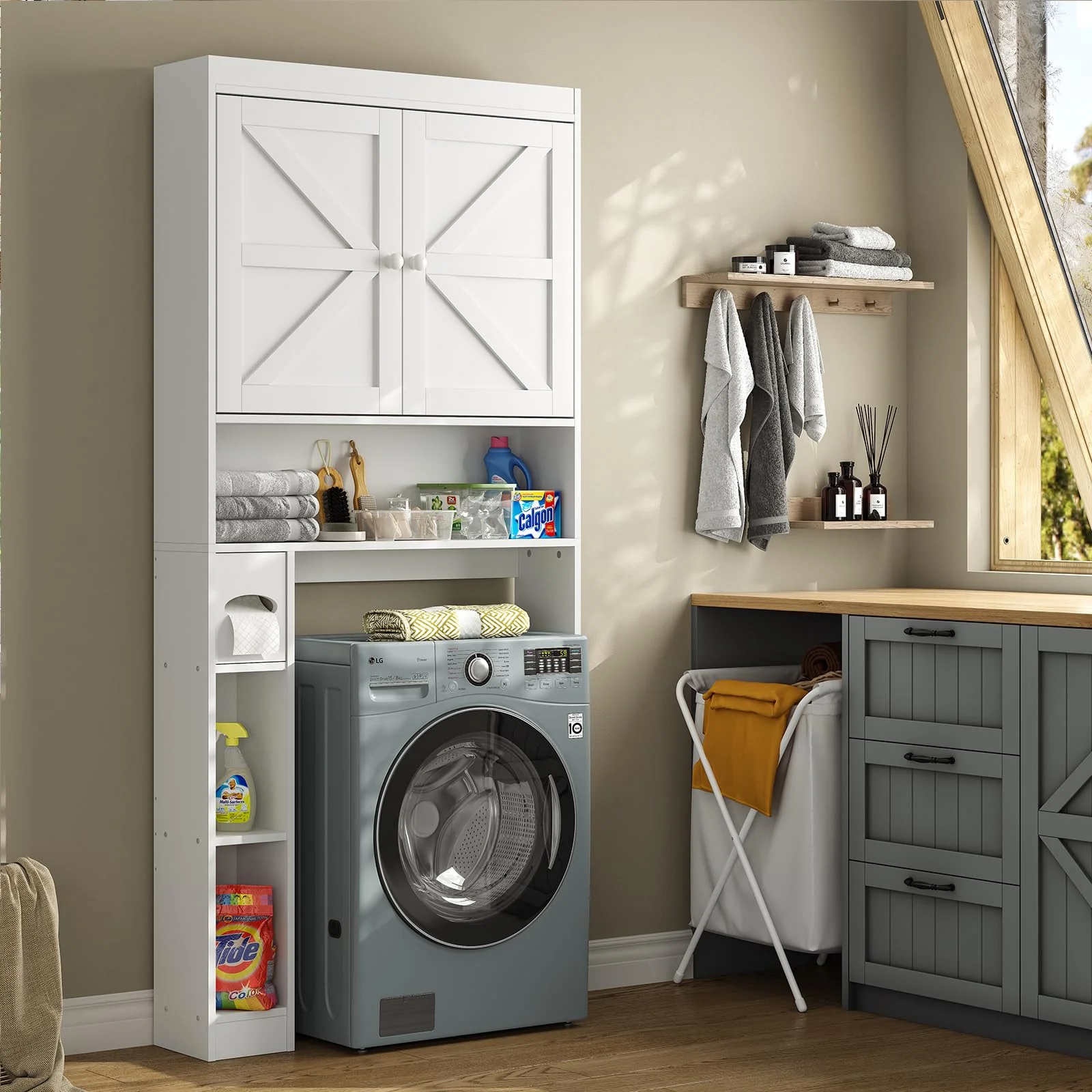 - ��Sleek Lines. Modern Style��With a sleek design of farmhouse contemporary lines. this over-the-toilet storage shelf has a fine neutral finish bringing a touch of understated style and utility to your bathroom. All the features make such a small shelving to get your bathroom to life.