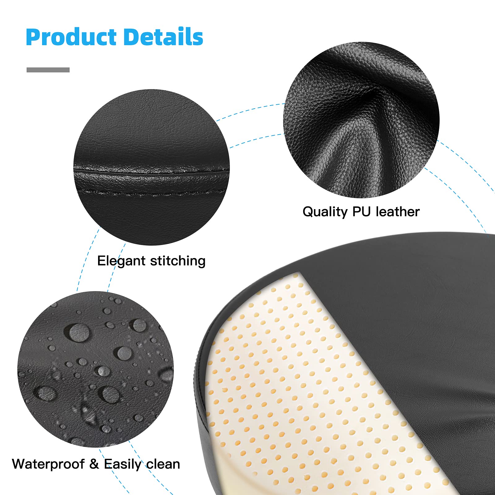 - ��COMFORTABLE THICK SEAT PADDING��Stool chair with 13.5 diameter x 3 thick cushioned seat. brand new high density sponge bonded leather upholstery.double stitching to made it more durable and comfortable.Also.it can be swivel 360-degree. adjustable height from 18.7 to 23.8 inches.