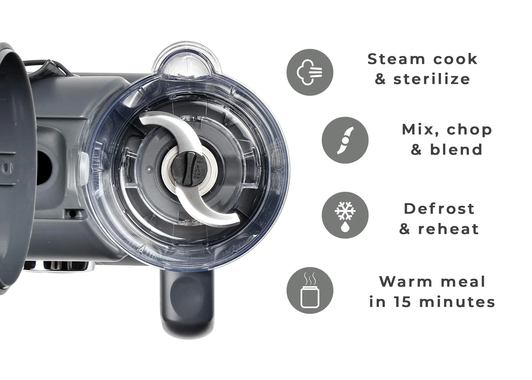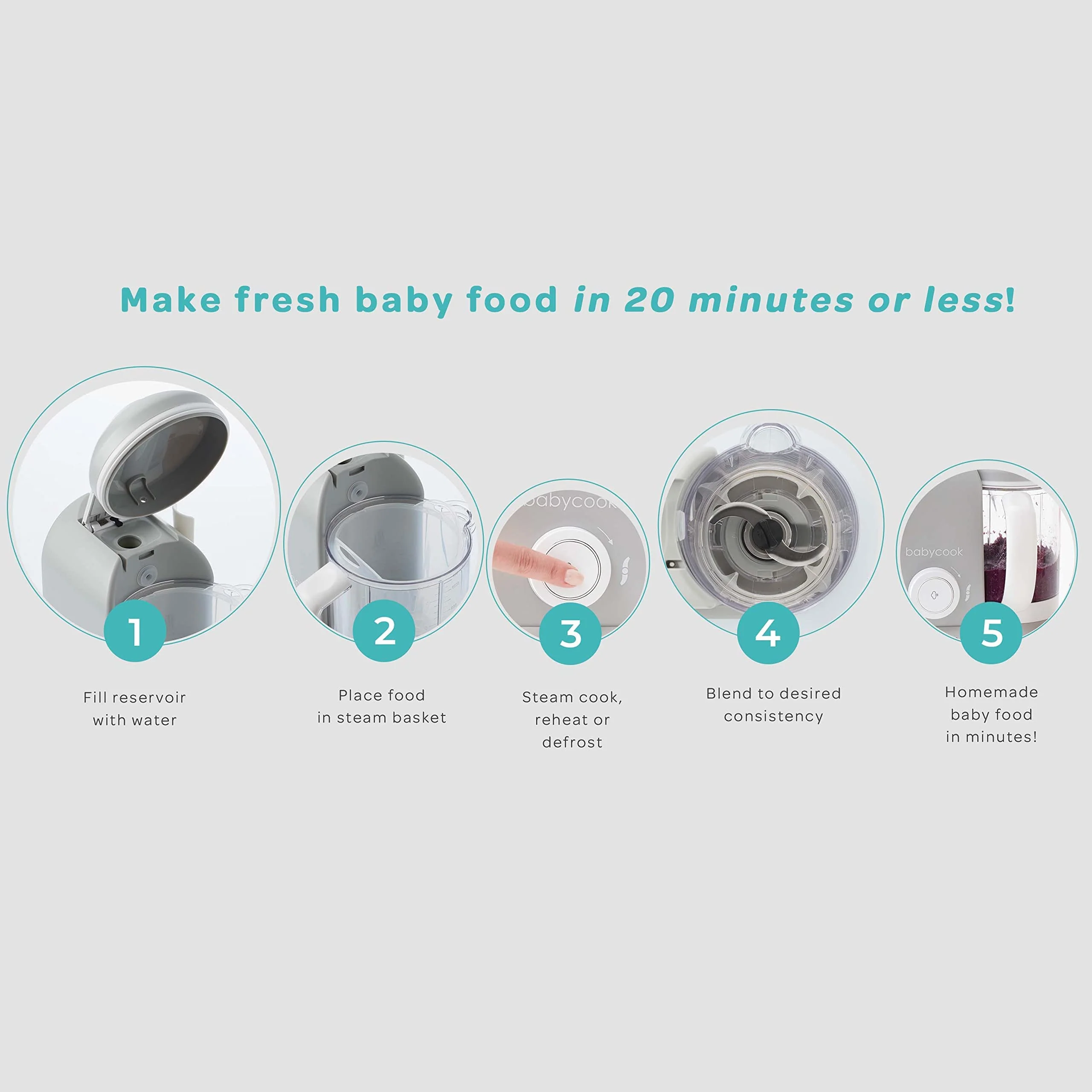 - 4-in-1 Function - Steam Cooks. Blends. Defrosts. Reheats Healthy Food All In One Appliance. Babycooks Elevated Steam Basket Allows True Steam Cooking. Resulting In Minimal Nutrient Loss. Use Leftover Water As Puree Stock To Help Control Consistency & Texture Of The Puree When Blending. Competitors Do Not Raise Food Above The Water. Thus Not Steam Cooking But Rather Braising The Food. When Food Sits In Water It Results In Greater Nutrient Loss As It Pulls Nutrients From The Food.
