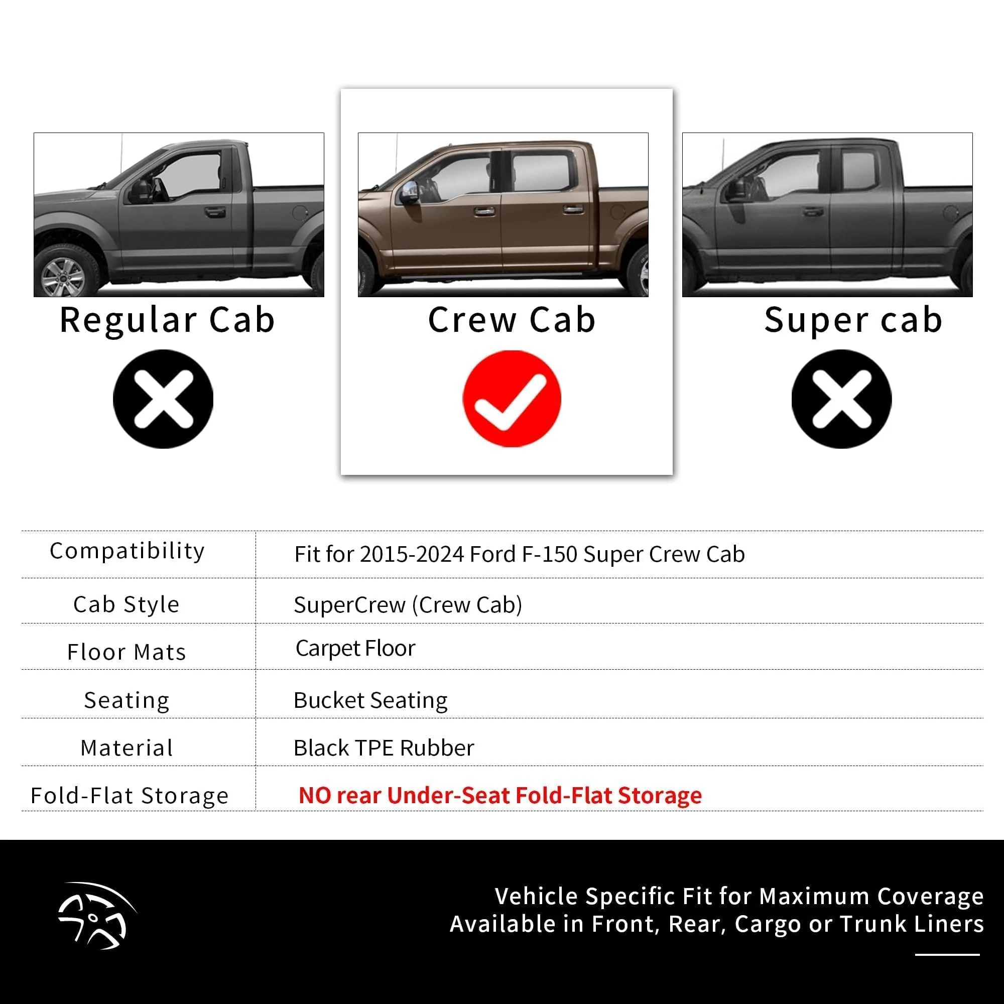 - CUSTOM FIT: These floor mats are compatible with 2015 2016 2017 2018 2019 2020 2021 Ford F-150 SuperCrew Cab. Only fits SuperCrew cab with first row bucket seats (4 full size doors). 3D laser scanning technology gives full protection to both the front and back. These mats are not for vehicles with vinyl floors. Please remove old floor mats before installing new floor liners.