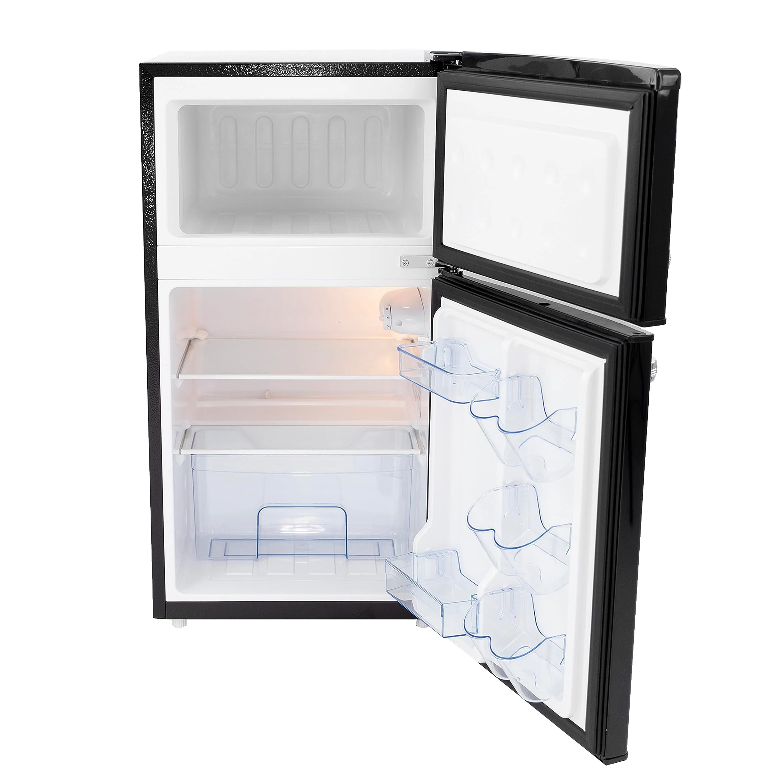 - VERSATILE FEATURES: 2 Adjustable removable shelves. crisper drawer. door shelves for drinks or snacks. mini ice cube tray