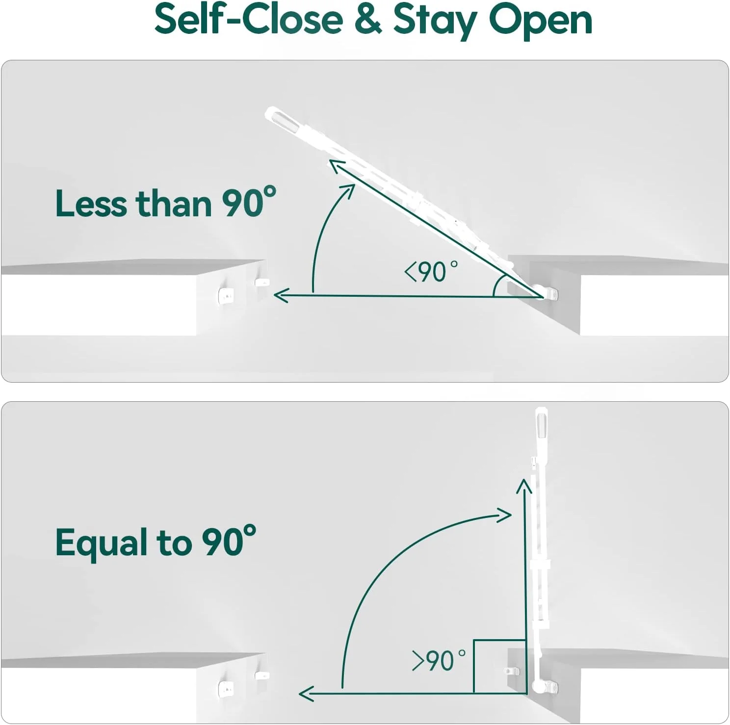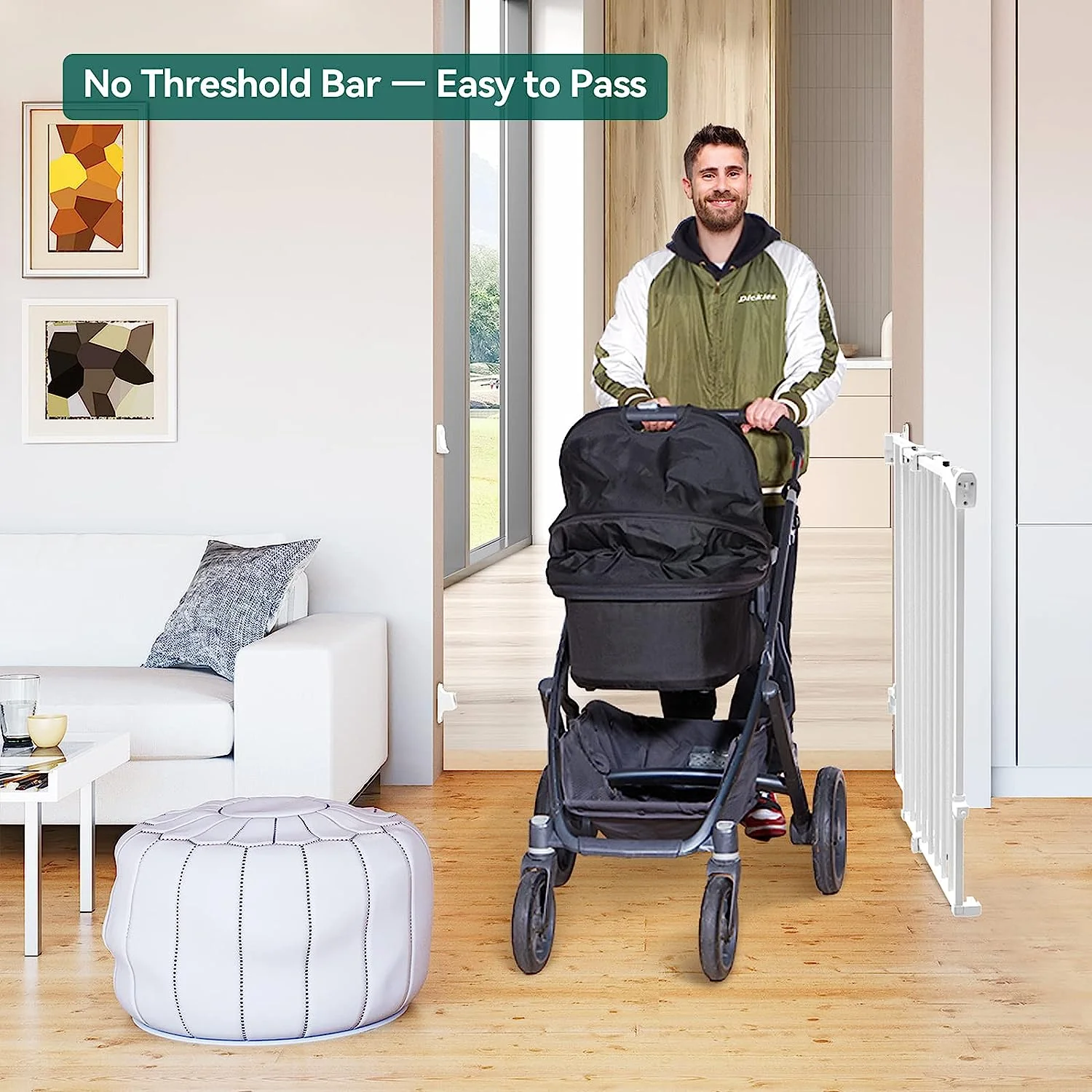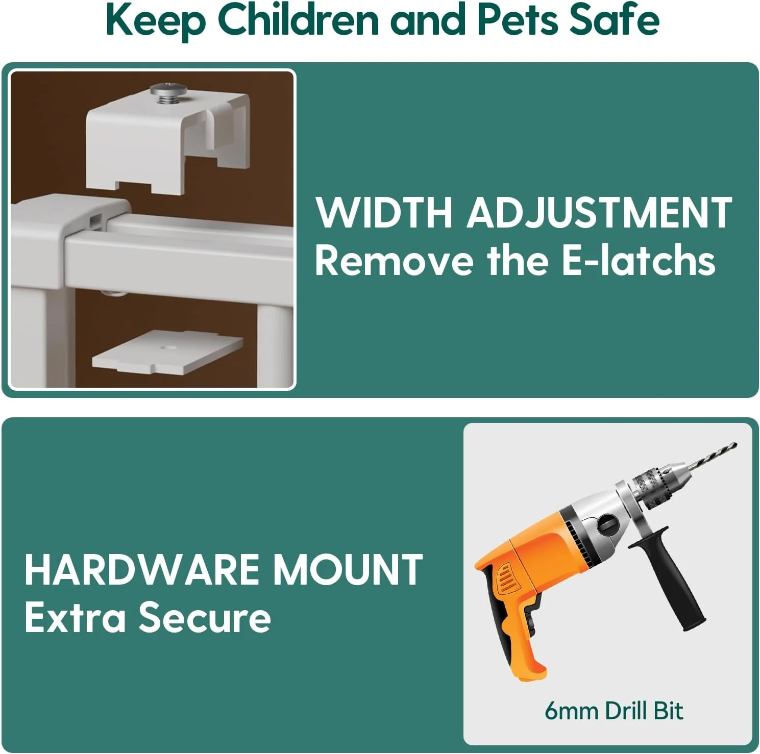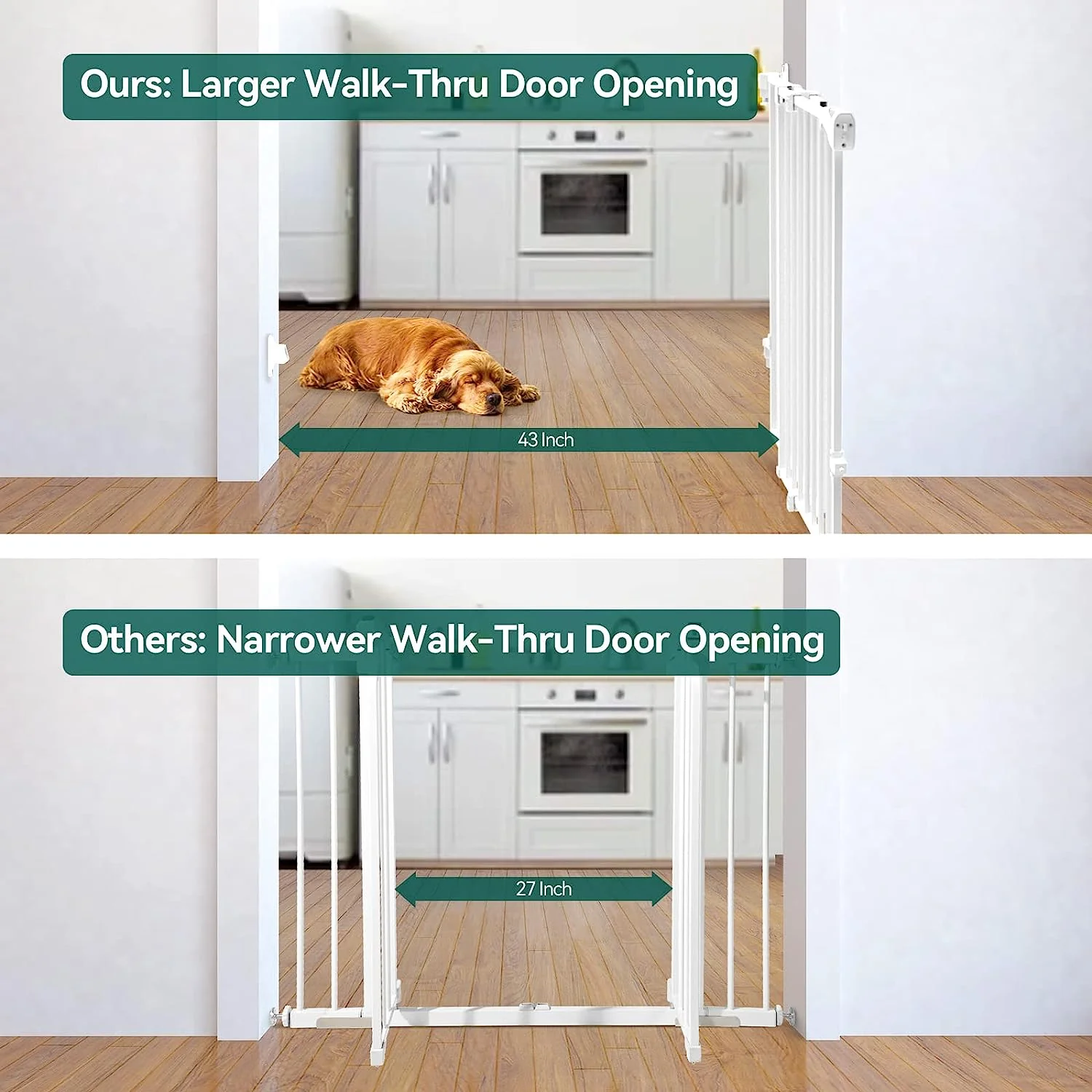 - EXTRA WIDE WALK THRU DOOR: Unlike pressure-mounted gates. the hardware mounted gate will open the full width of the stair for easy walk-through; and the sill-free design minimizes tripping.