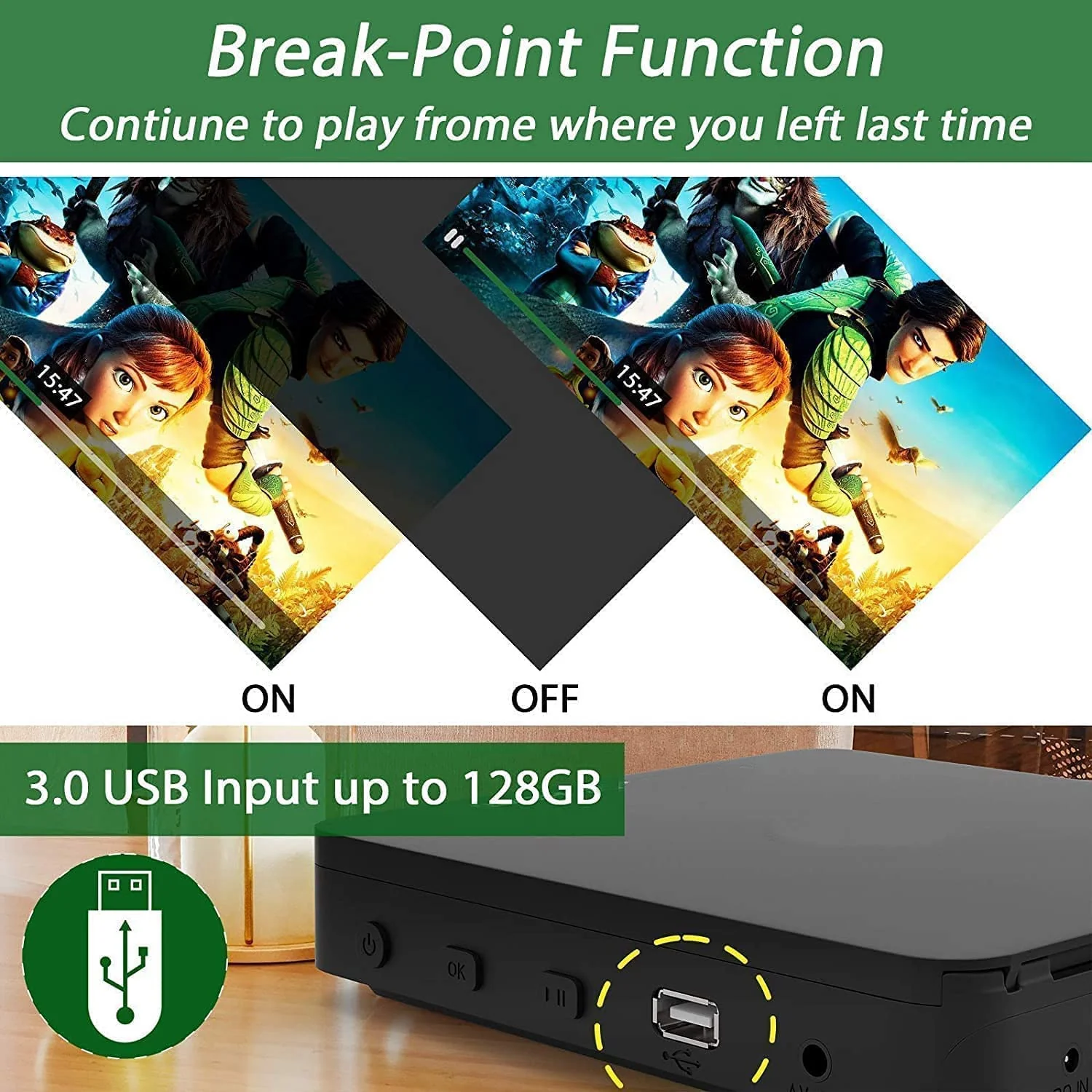 Compact DVD player. made from high grade material and high quality drive core. this DVD player can read discs fast with noise reduction. so you can focus on your favorite video . Anti-shock protection ensure uninterrupted viewing pleasure.