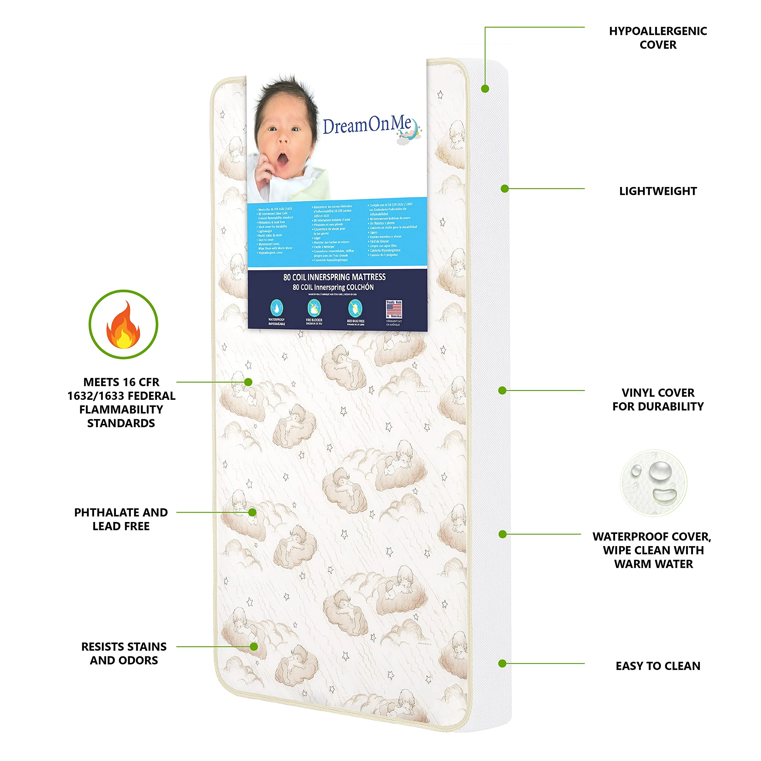 • DUAL SIDED: Features reversible design - a white infant side covered with breathe-flow material & brown-cloud print toddler side with a waterproof cover with lock stitch seams: The reinforced waterproof cover and binding resist liquids and stains