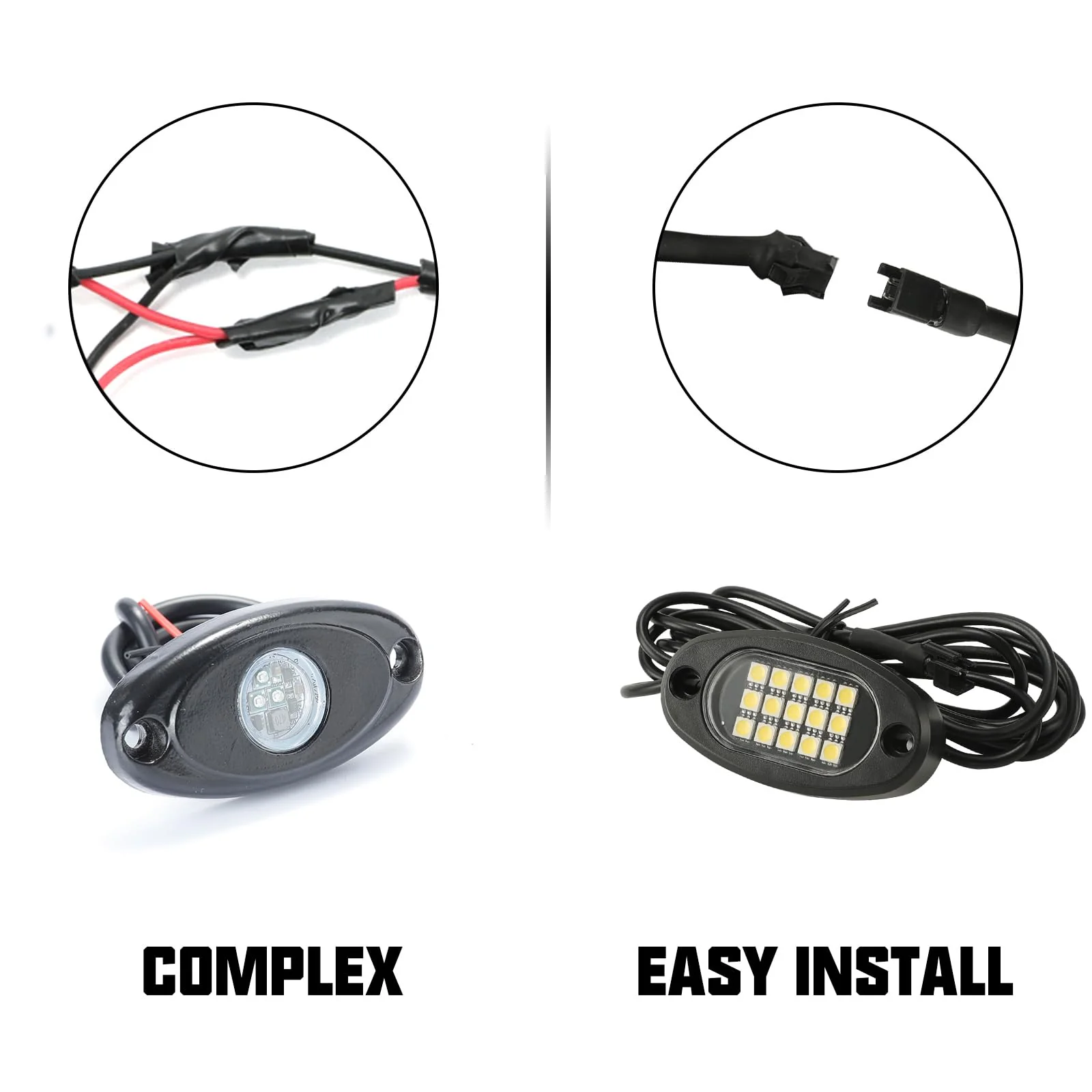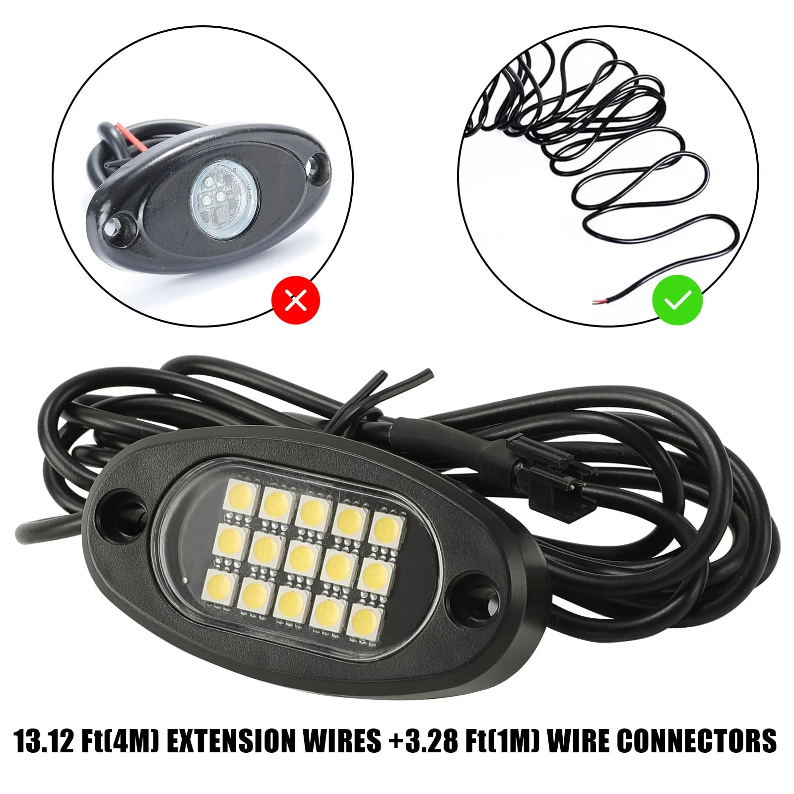 - ��CAME WITH 16.4FT(5 METRES) EXTENSION WIRES EACH LIGHT. HIGH ADHESIVE STICKERS PROVIDED��Came with connected 5 metres extension wires each light. helps you to extend rock lights installtion area. We also provide 20 pieces high adhesive stickers. screws install tools. Easily installed onto your truck fender board or installed on motorcycles.