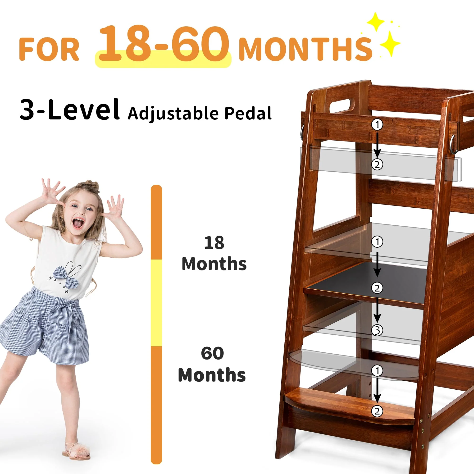 - HEIGHT ADJUSTABLE DESIGN: This toddler kitchen stool suitable for kids over 18 months. 3 levels adjustable platform and 2-stage adjustable foot pedal allow to get the perfect height for children of any age. which could witness your kids growth. 2 levels adjustable crossbar with rings can meet the needs of children sitting and standing.